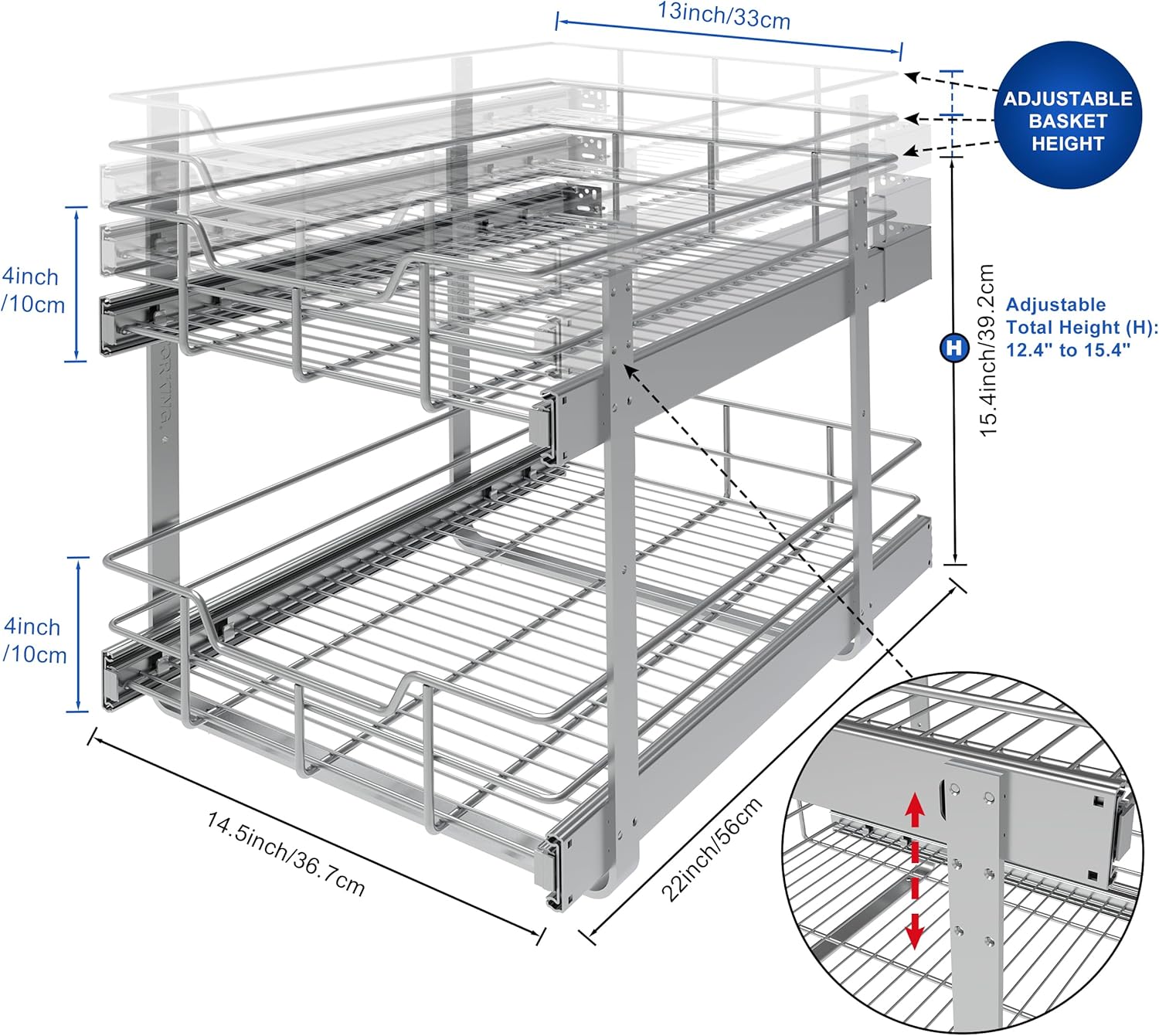 2 Tier Pull Out Cabinet Organizer 15" W X 22" D, Slide Out Drawers For Kitchen Cabinets, Pull Out Drawers For Cabinets Capacity Heavy Duty Caddy, Cabinet Pullout Shelves Chrome-Plated,Bathroom Pantry