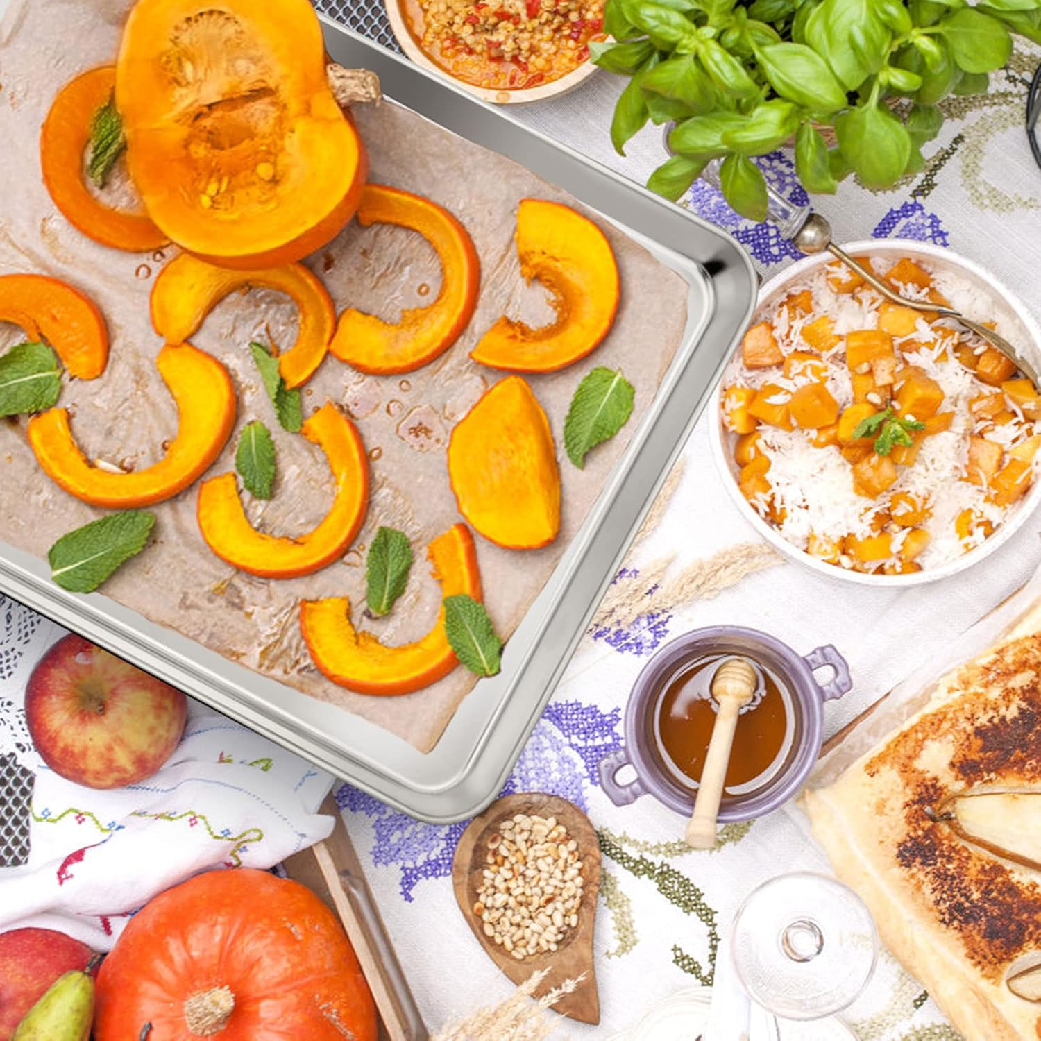 - 【Durable Use】The baking trays feel heavy-duty when holding on the hand, Solid steel construction would extend the service life of the pan, More unbreakable than ceramic pan, More durable and more environmentally friendly than the disposable foil pans