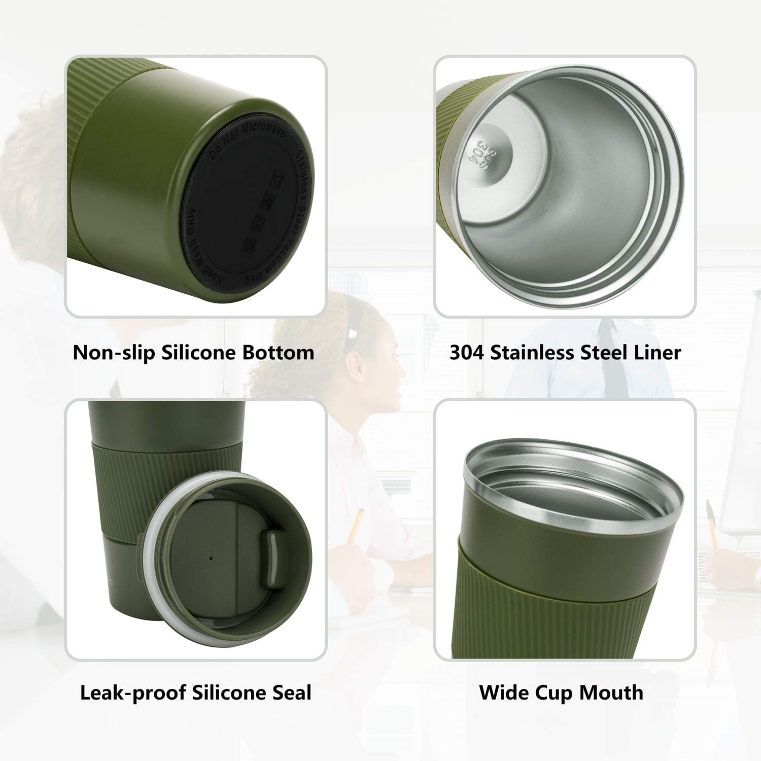 16oz Travel Coffee Mug Spill Proof, Insulated Coffee Mug with Lid, Leakproof Coffee Tumbler,Stainless Steel Vacuum Coffee Cup for Hot/Cold Drinks, Reusable Coffee Cup for Men Women -510ml,Dark Green