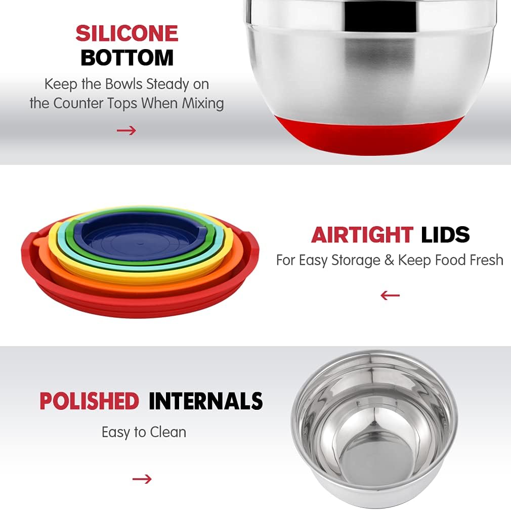 - [ NON SLIP BOTTOMS] Flat silicone grip portion on the bottom would prevent the metal bowls slippage when mixing, beating and whipping! Also protect the desk from high temperature.