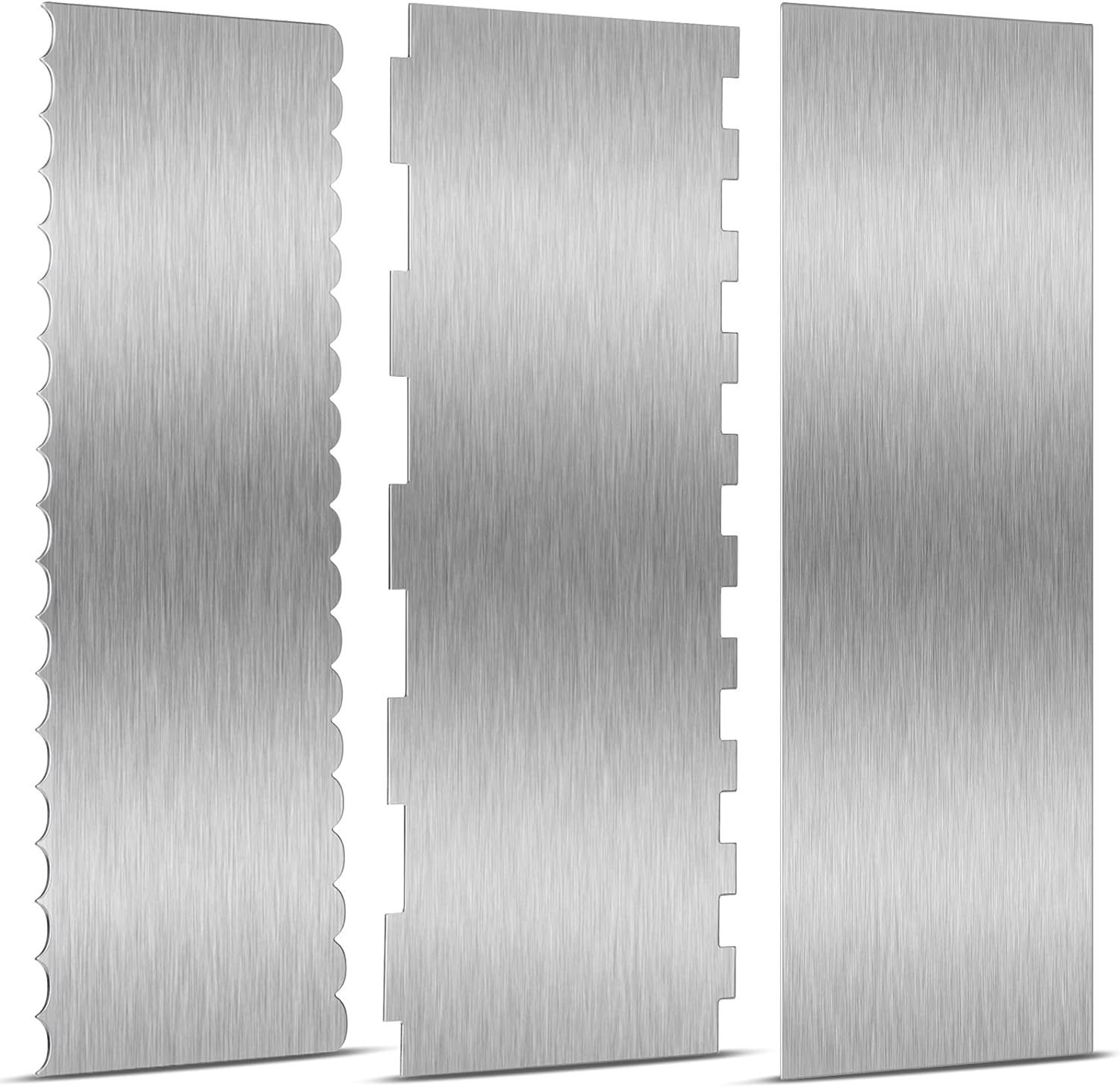 3 Pieces Stainless Steel Cake Scraper 10 Inch and 9 Inch Large Double Sided Patterned Edge Stripe Edge Smoother Scraper Cake Decorating Comb Pastry Cutter for Butter Mousse Cream Decoration