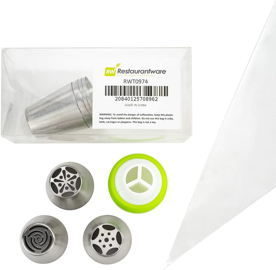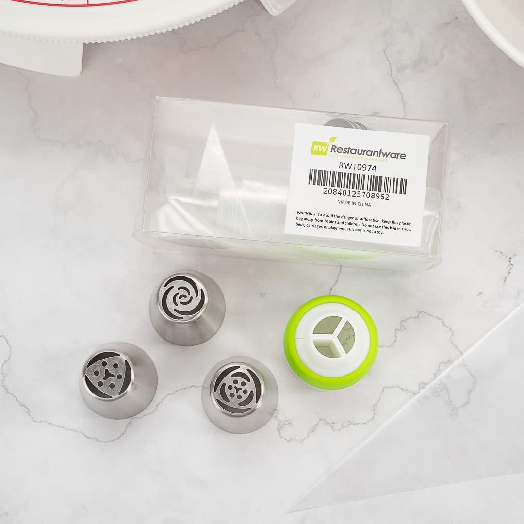 Restaurantware Pastry Tek Russian Piping Tips Set 18 Piece Durable Cake Decorating Kit - 7 Piping Tips 10 Piping Bags Stainless Steel Piping Bags And Tips Set 1 Tri-Color Coupler