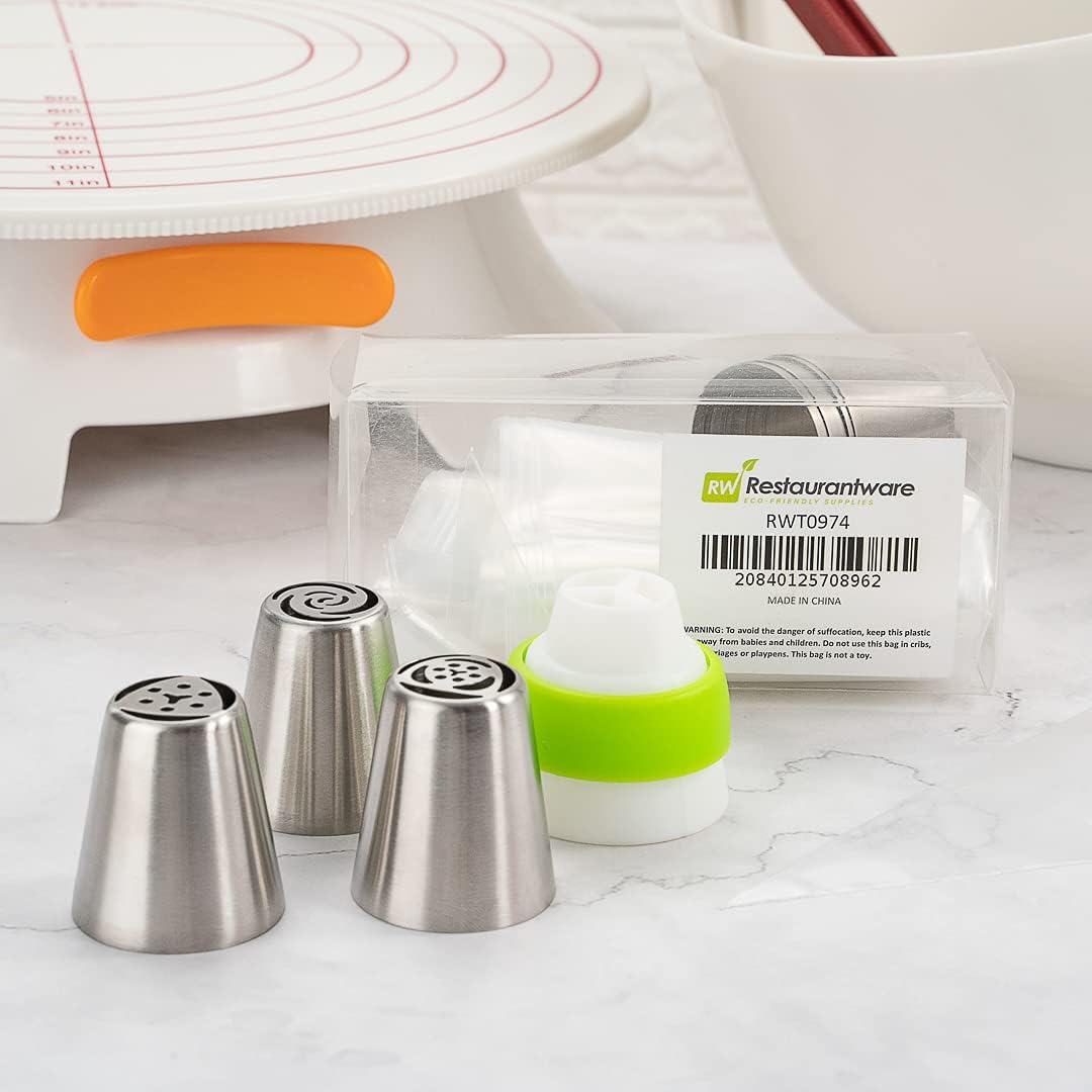 - ALL THE TOOLS YOU NEED TO DECORATE: This piping tip set brings 7 Russian piping tips, 10 piping bags, and 1 tri-color coupler so you can frost a variety of designs and flowers on cakes.