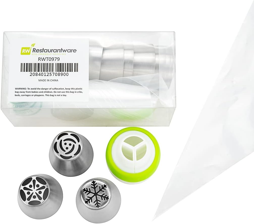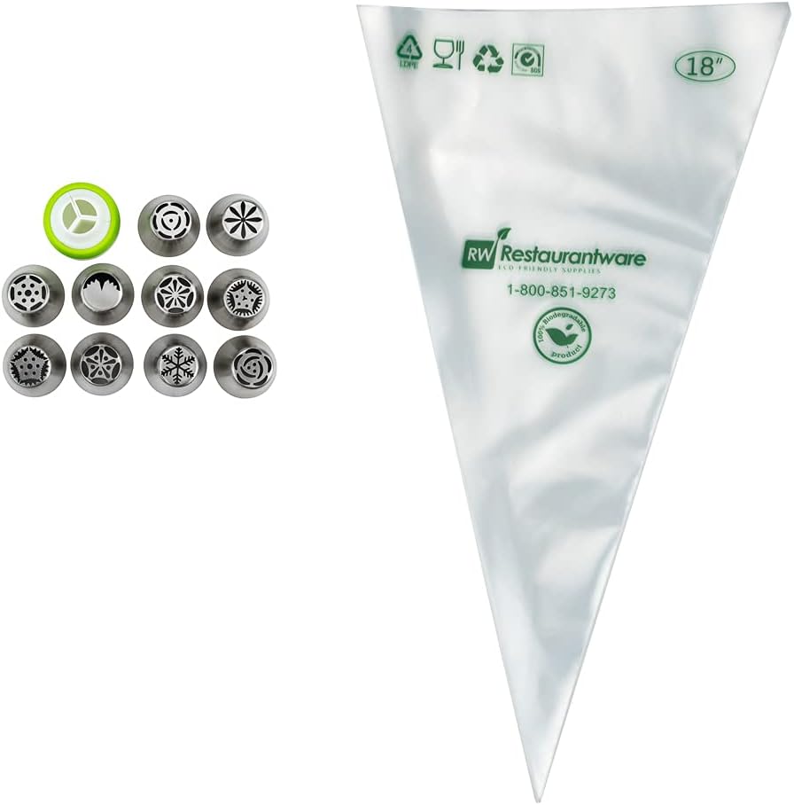 - ALL THE TOOLS YOU NEED TO DECORATE: This piping tip set brings 10 Russian piping tips, 10 piping bags, and 1 tri-color coupler so you can frost a variety of designs and flowers on cakes.