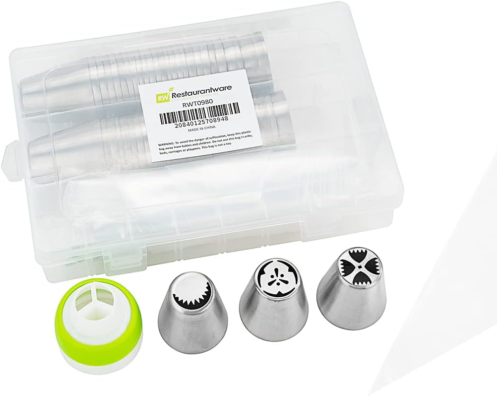 Restaurantware Pastry Tek Russian Piping Tips Set 68 Piece Durable Cake Decorating Kit - 57 Piping Tips 10 Piping Bags Stainless Steel Piping Bags And Tips Set 1 Tri-Color Coupler