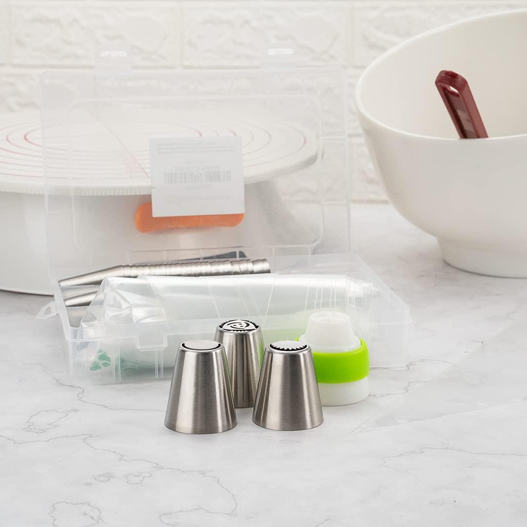- ALL THE TOOLS YOU NEED TO DECORATE: This piping tip set brings 57 Russian piping tips, 10 piping bags, and 1 tri-color coupler so you can frost a variety of designs and flowers on cakes.