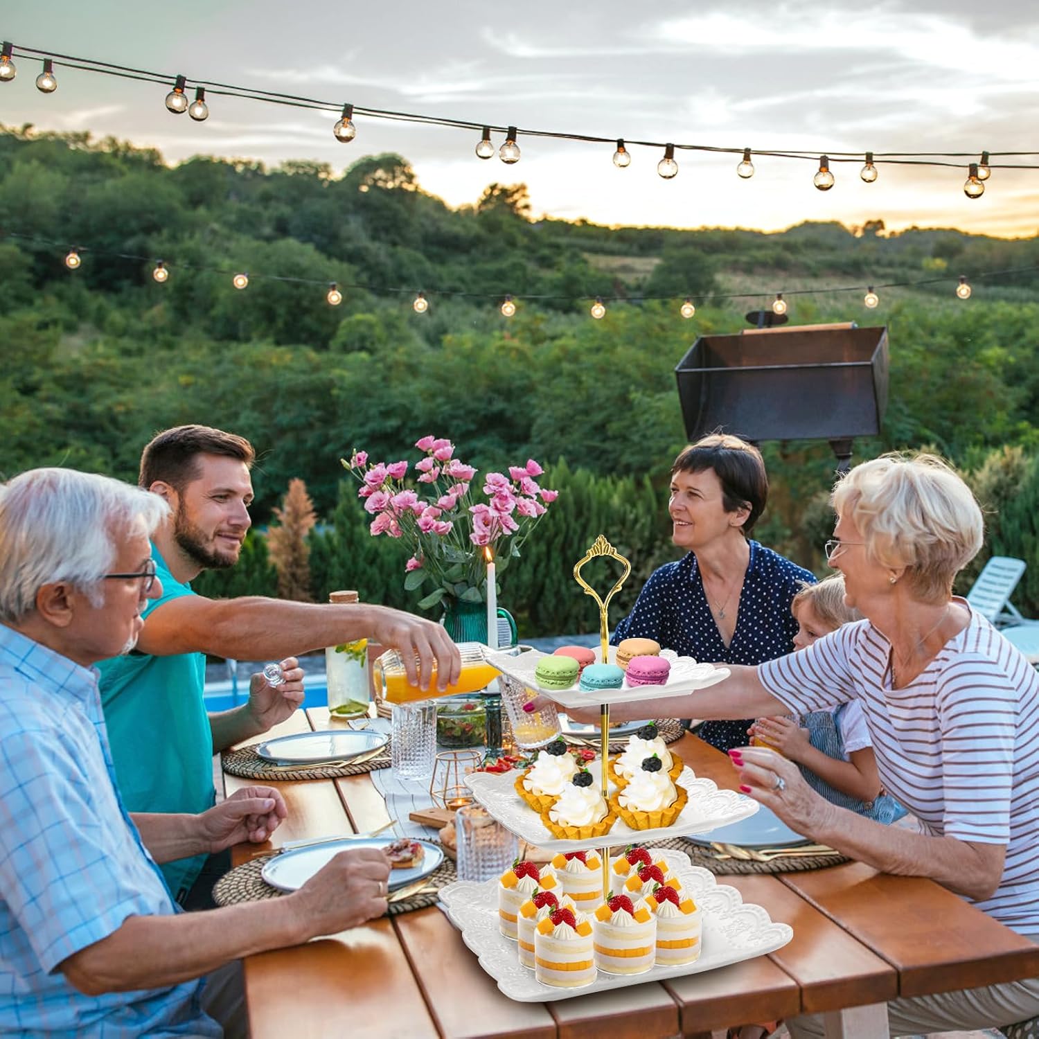 - Value pack of 2 tiered dessert display tower, high quality porcelain platters with exquisitely shiny gold metal rack.
