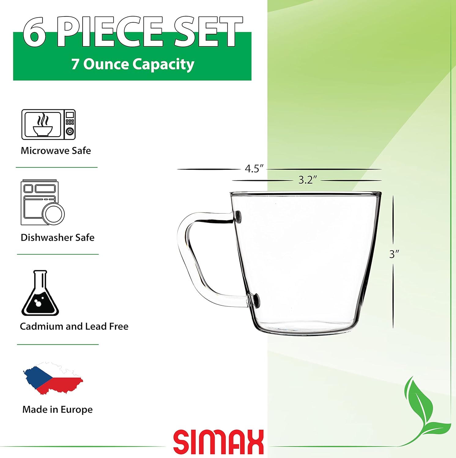 SIMAX Small Clear Glass Coffee Mug Set of 6 - 7 Ounce Heat Safe Borosilicate Tea Cups With Handles for Cappuccino