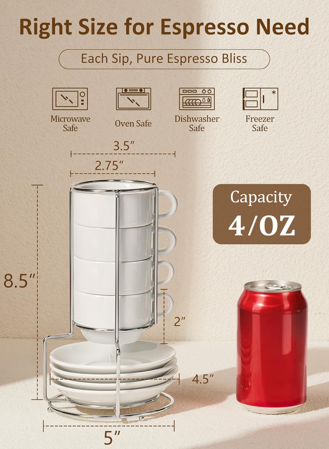 Yedio Porcelain 4 oz Espresso Coffee Cups with Saucers and Metal Stand, Porcelain White Stackable Cappuccino Cups Set of 4