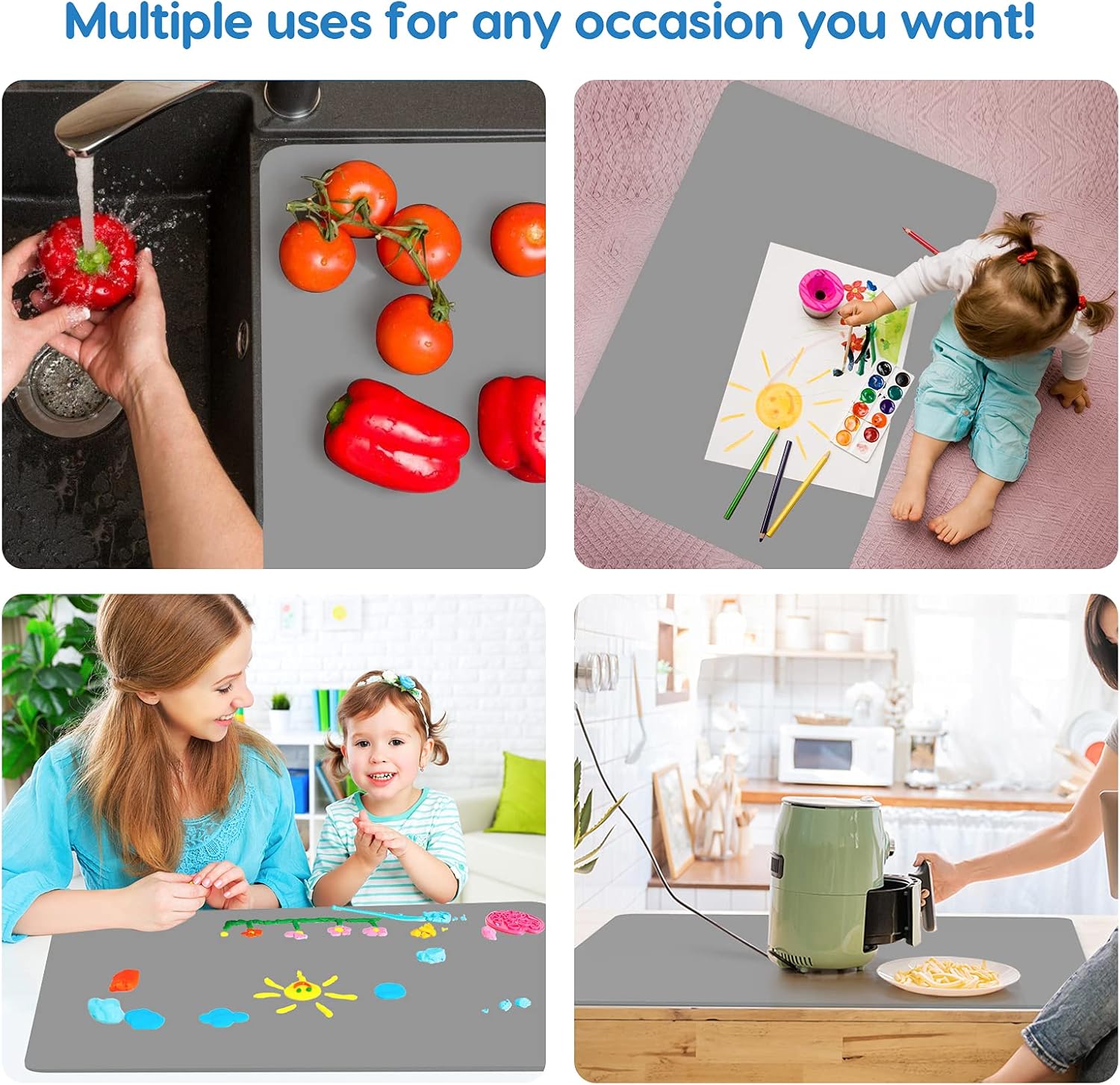 - 【A MUST-HAVE MAT】: Our extra large silicone counter mat are widely used for home, kitchen, office, classroom, outdoor, baby, pet and any occasion. Can be used as countertop mat, table mat, pastry mat, placement mat, heat resistant mat, craft mat, pet feeding mat or a baby pad etc. Table protector, mat for crafts, jewelry, casting moulds and other DIY tools and materials. It’s cuttable to fit different sizes and shapes.