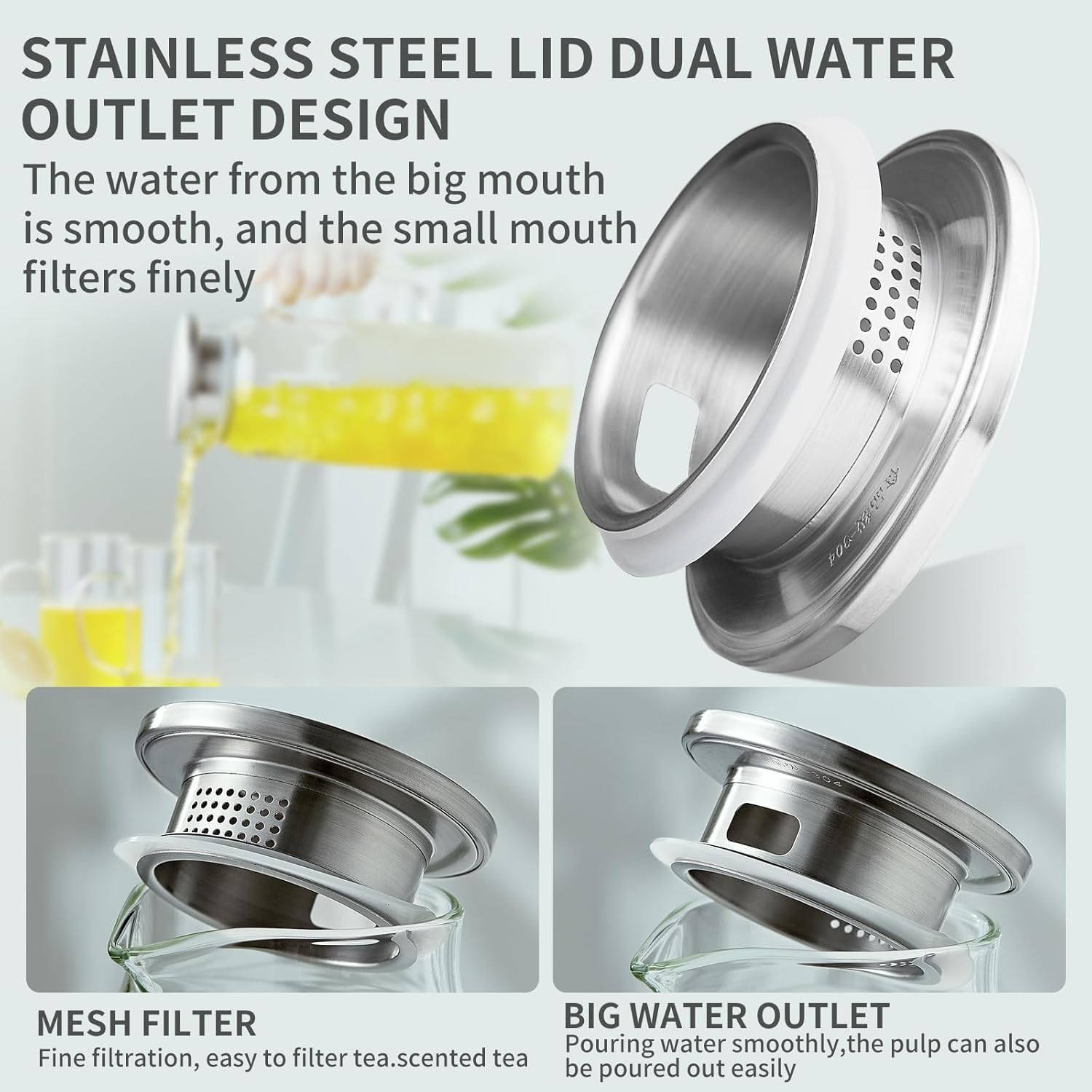 - High Borosilicate Glass: The water pitcher is made of heat resistant Borosilicate glass and can Two Different Pour Functions: The iced tea pitcher comes with premium 304 stainless steel lid that has 2 different pour functions, one with tiny holes to act like a strainer to keep ice or fruits inside pitcher when pouring and 180 degree turn of the cap provides a “wider” mouth. The lid also has a silicone ring that improves sealing performance and reduces leaks or spills.
