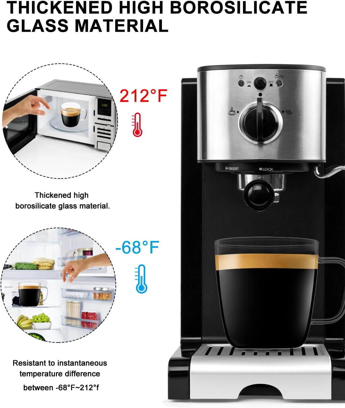 - HIGH-QUALITY MATERIALS - This clear borosilicate coffee glasses can withstand sudden changes in the temperature difference between hot and cold temperature range(-68°F~212°F),It has extremely high heat resistance and explosion resistance,and is durable.So it can be safely used in dishwashers,microwaves and refrigerators,more durable to stand the daily use.