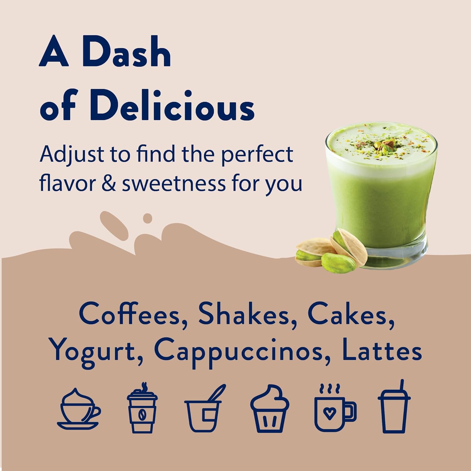 - PERFECT PISTACHIO: This syrup for coffee brings a guilt-free pistachio treat. Use the flavored syrup to make delicious coffees, lattes, tea, protein shakes, smoothies, oatmeal, yogurt, overnight oats, cocktails and so much more.
