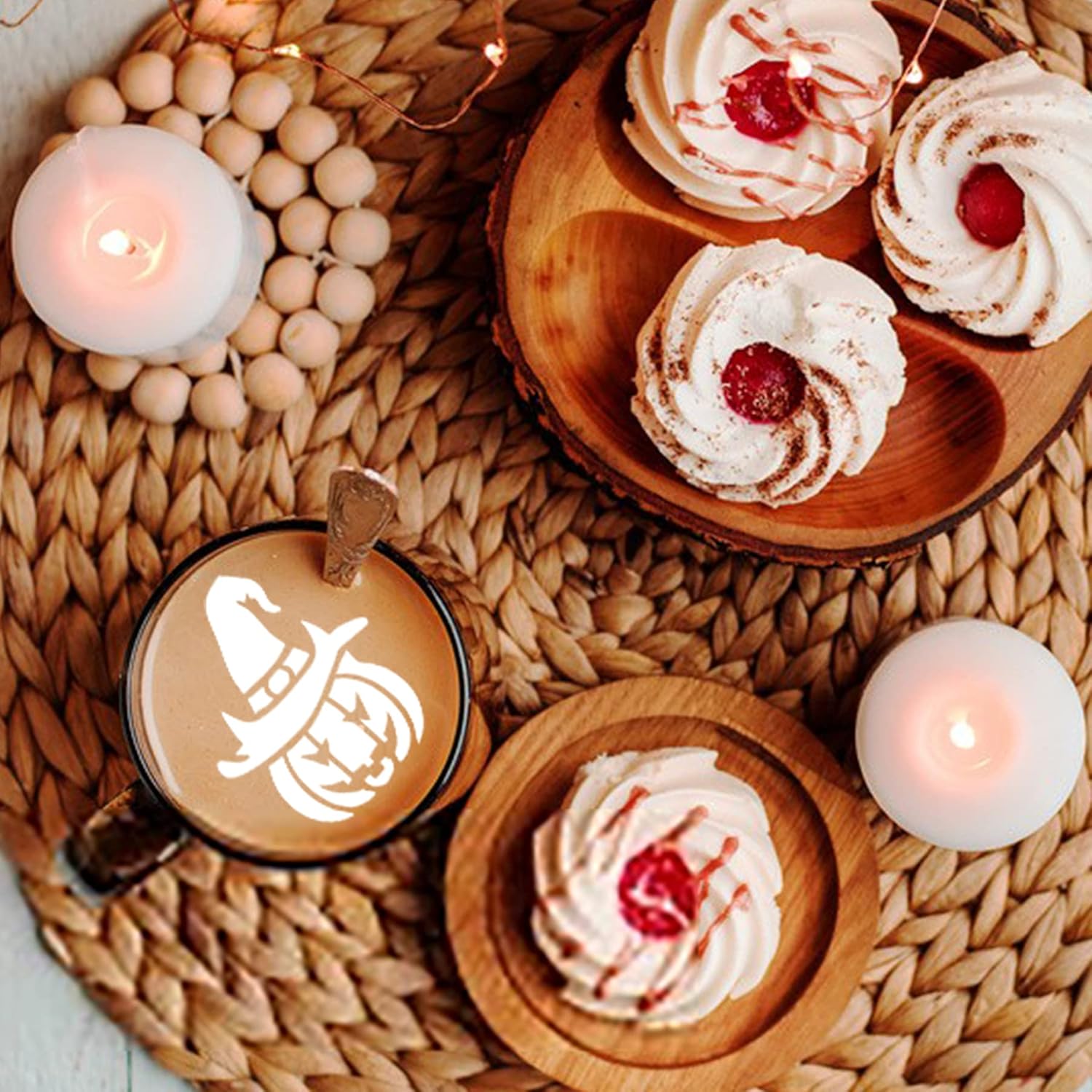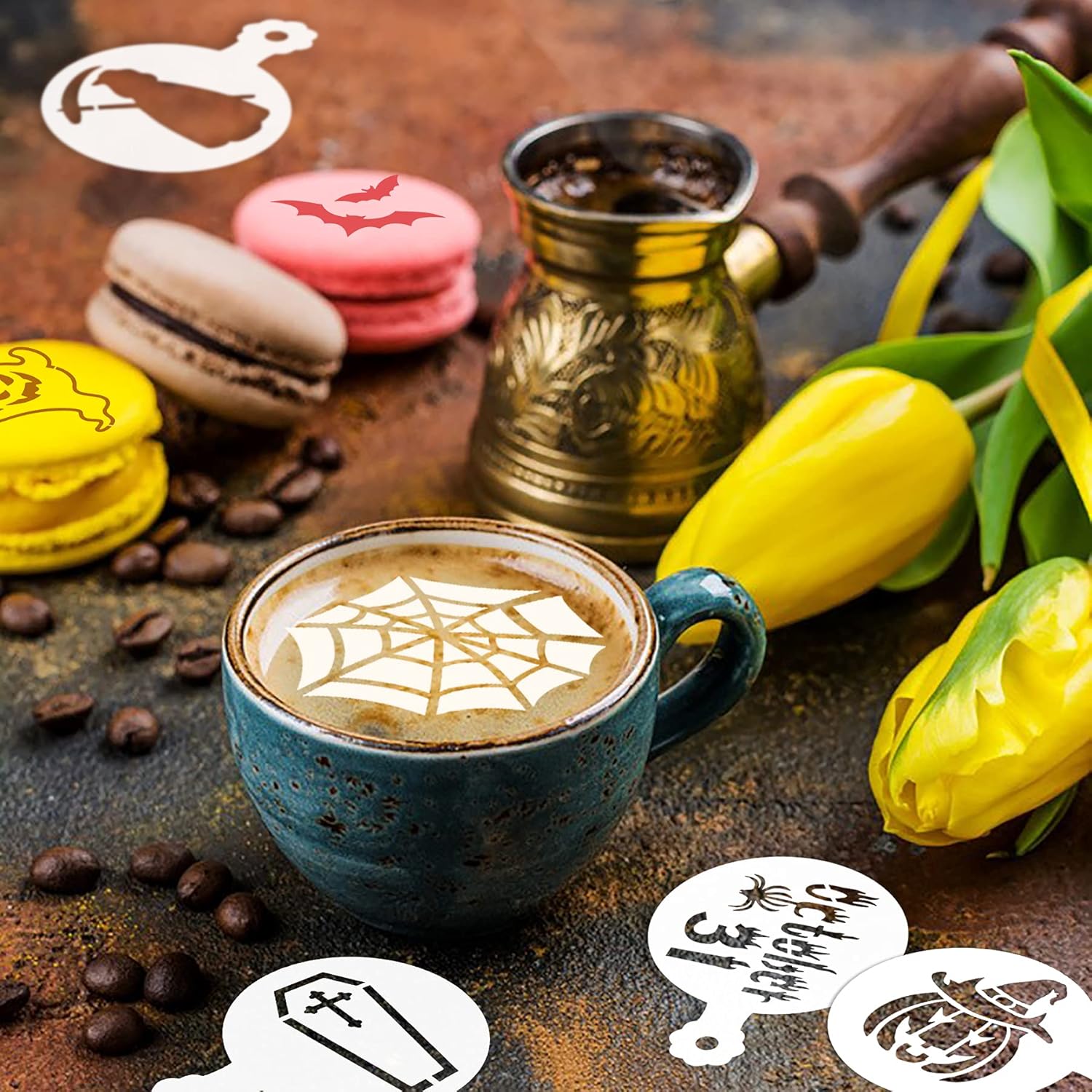 - Coffee Cake Latte Making - Cover the template on coffee, biscuit or cake, sprinkle with sugar, chocolate powder or other edible powder, and then peel off from the template, a complete Halloween theme pattern will be presented soon.