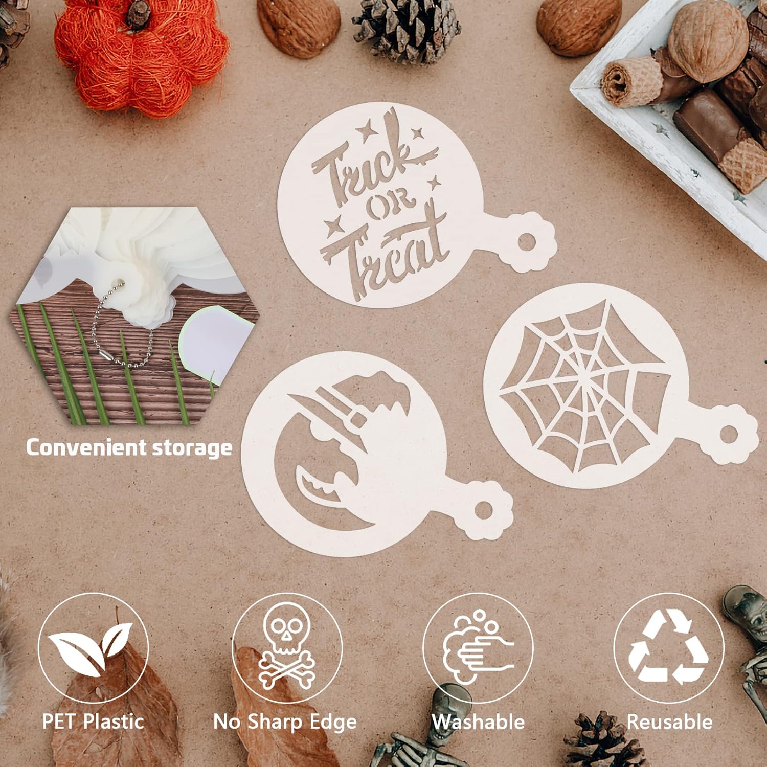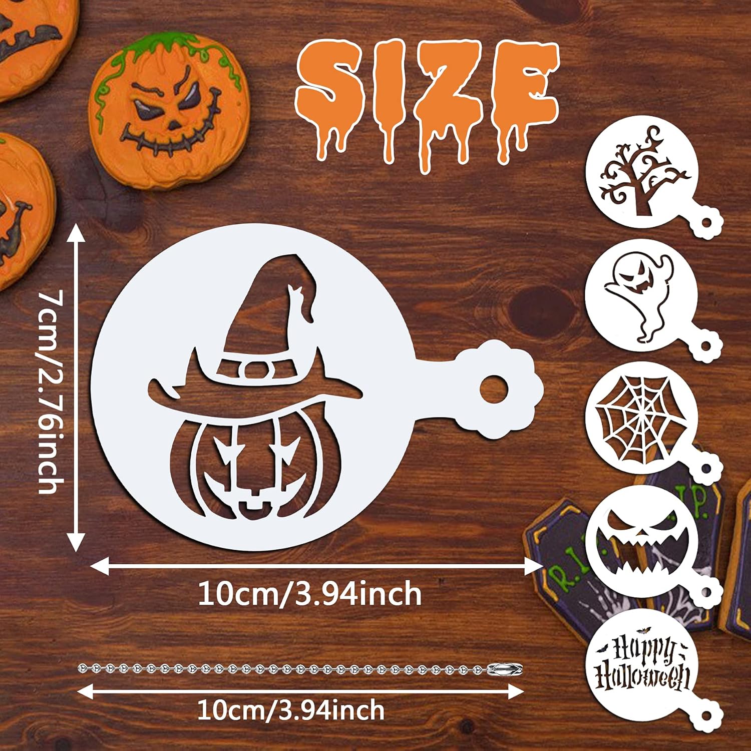 - Size and Material - The diameter of the stencils for cookies is 2.76in. The cake stencils are made of PET plastic, which are strong and durable. They are cut by laser, and there have no sharp edges, which is safe for children. These Halloween cake stencils can be in direct contact with food. After using, please wash it with soap and water, and it is convenient for you to reuse and store.
