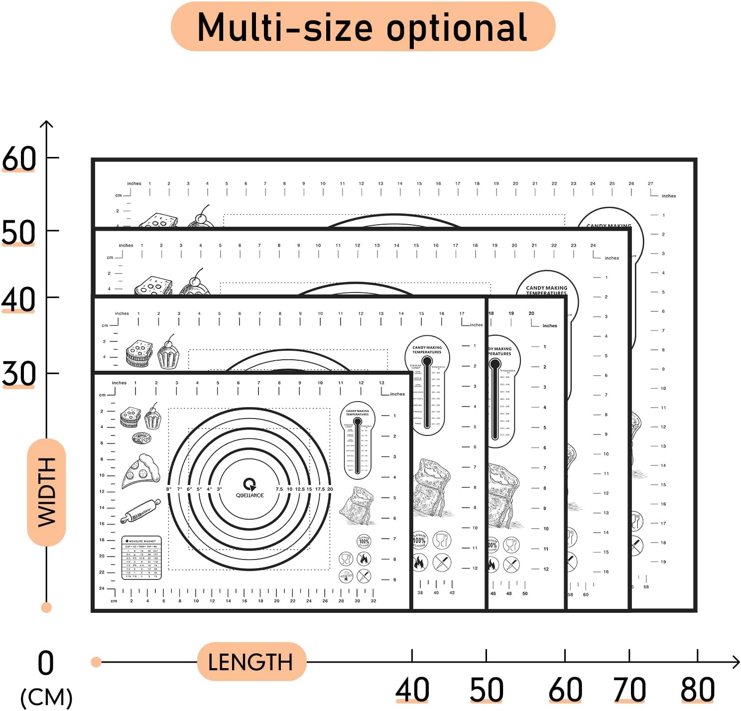 - FOOD GRADE SILICONE: silicone pastry mat made of 100% Food-Grade Silicone, no harm to the body, safe use for temperatures of -45 degrees F (-43 C) to 450 degrees F (230 C), no unpleasant chemical odors, providing you more time to enjoy your creations.