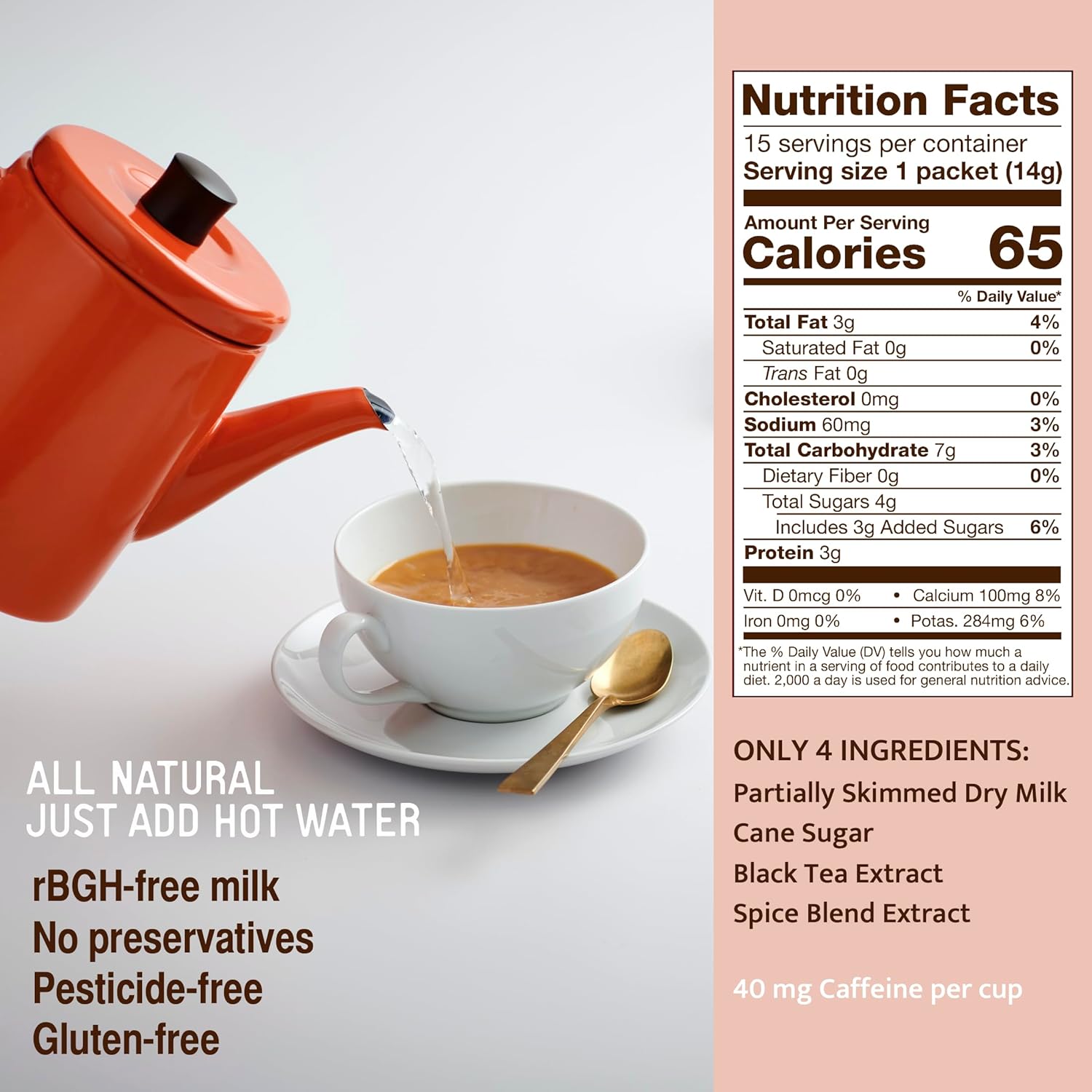 - VERSATILE & CONVENIENT PREPARATION: Transform your daily ritual with the simple addition of hot water for a comforting cup of traditional chai that warms body and soul. Or, for warmer days, mix with cold milk and ice for a refreshingly cool chai experience that's perfect for summer. Our specially formulated blend dissolves quickly and completely, ensuring a smooth, consistent flavor whether enjoyed hot or coldābringing cafĆ©-quality chai to your home in seconds.