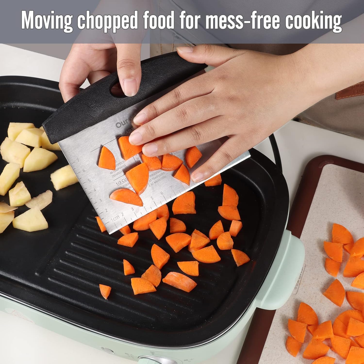 - Sharp bench scraper chopper: The pastry scraper is made from premium 430 stainless steel which is anti-rust and anti-deformation. The sharpness can stand the test of time and will give you a good clean cut for ingredients