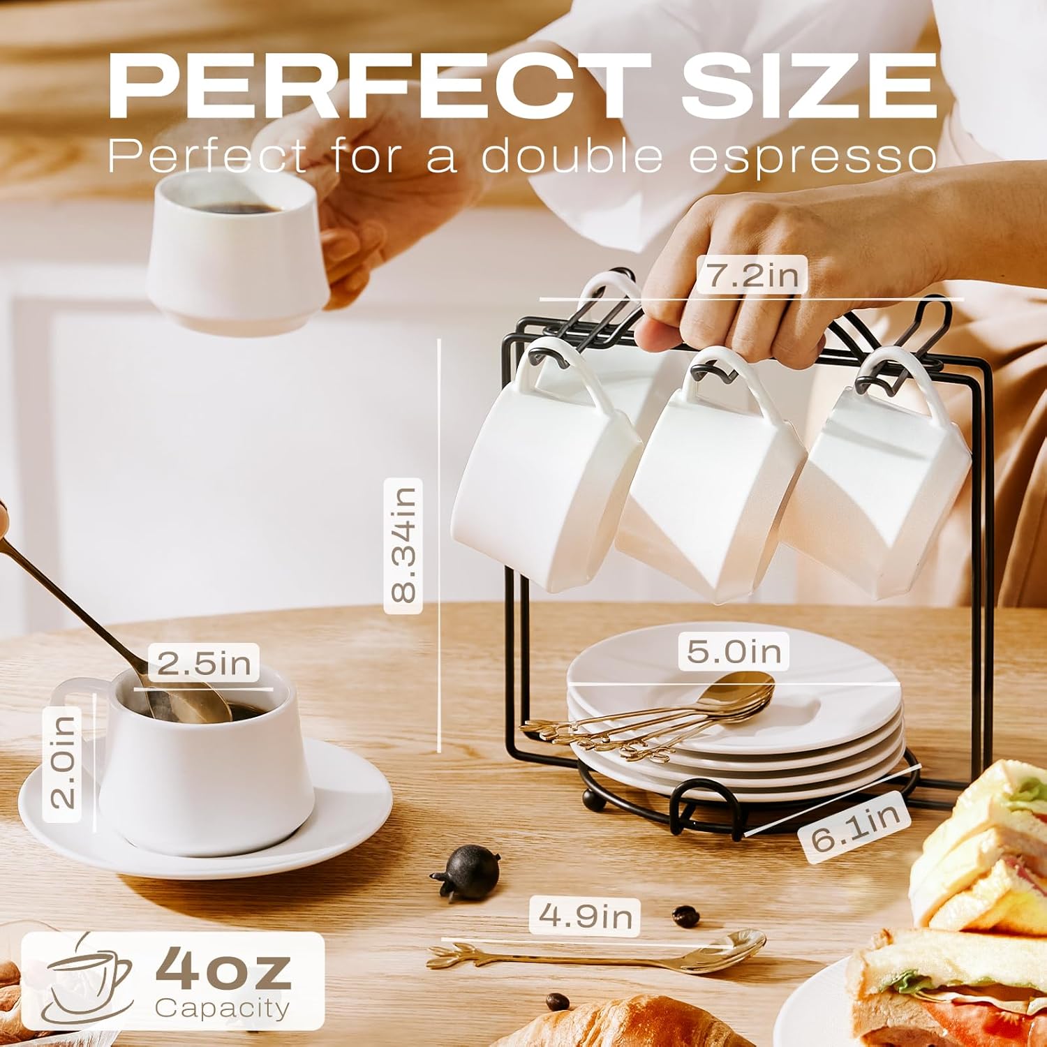 Lareina 3-Ounce Porcelain Espresso Cups Set of 6, Stackable Coffee Cups with Saucers, Spoons and Metal Stand, Ceramic Demitasse Mugs, Espresso Accessories for Machine, White