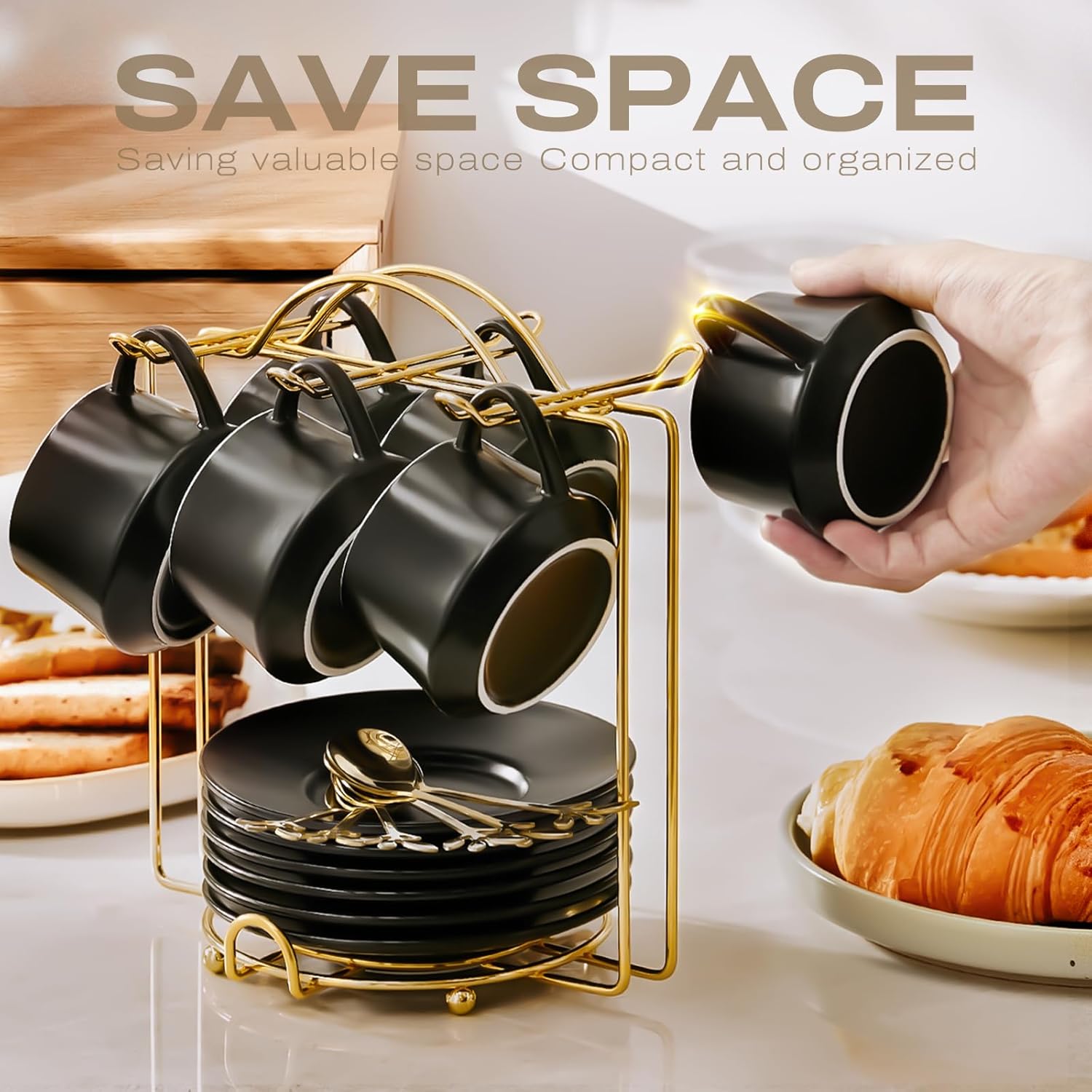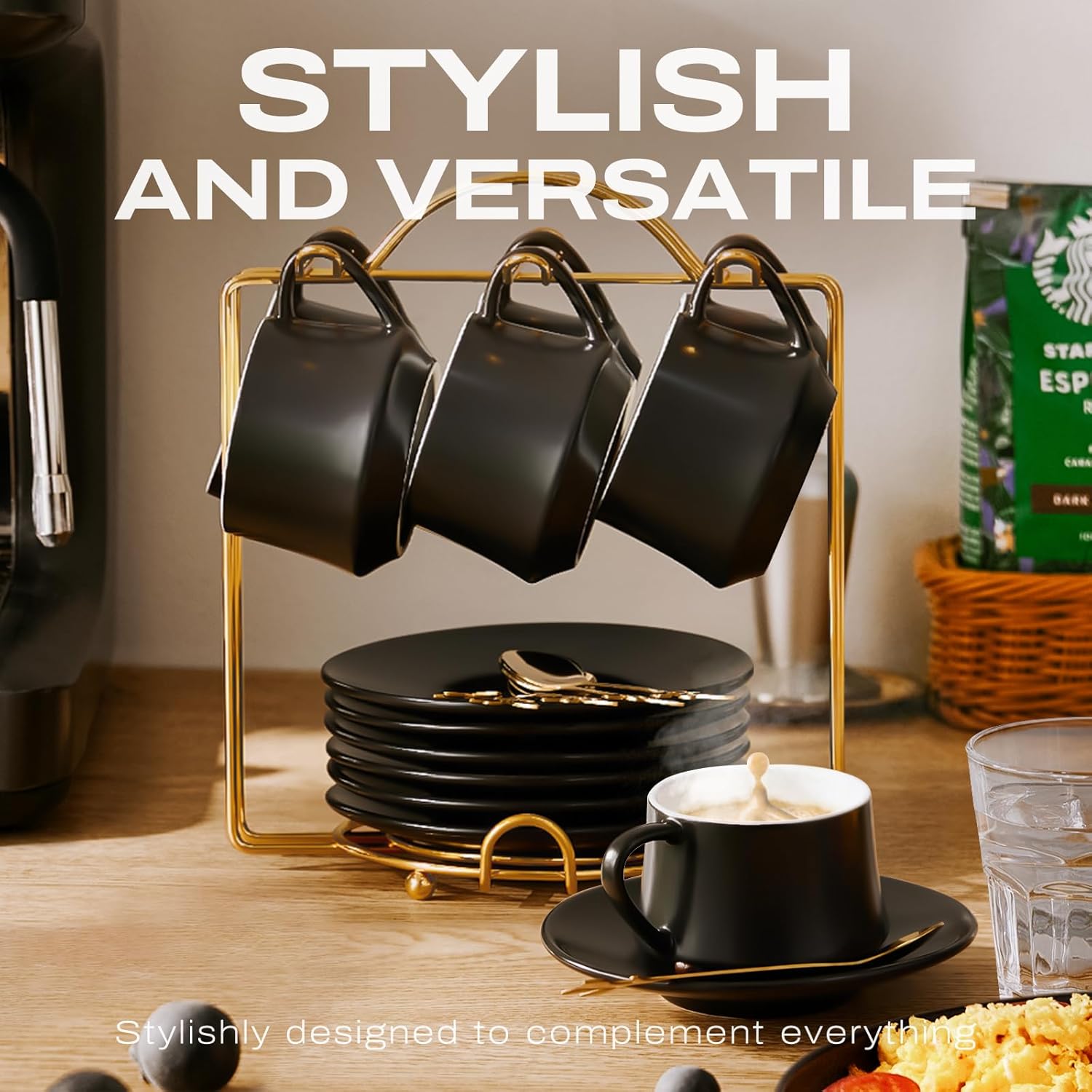 - 𝐓𝐮𝐫𝐧 𝐘𝐨𝐮𝐫 𝐂𝐨𝐟𝐟𝐞𝐞 𝐑𝐨𝐮𝐭𝐢𝐧𝐞 𝐢𝐧𝐭𝐨 𝐚 𝐑𝐢𝐭𝐮𝐚𝐥 𝐨𝐟 𝐉𝐨𝐲: This isn' t just a cup set - it' s an upgrade to your daily grind. The elegant saucers, spoons, modern metal stand, and timeless café-inspired design transform your morning coffee into a moment of sophistication. Whether you' re savoring a weekday pick-me-up or hosting a weekend brunch, this set elevates the ordinary into something extraordinary.