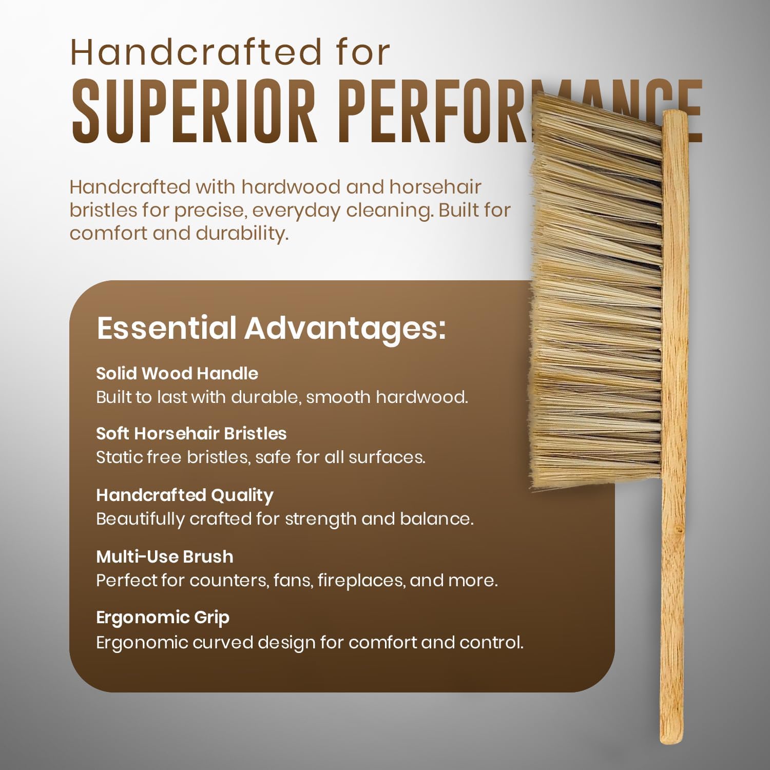 - βππππ-πππππππ πππππππ ππππππππβ¨ Our cleaning brush is made of high-quality natural hardwood, this dusting brush handle is highly resistant to break and durable to use. Never worry it will get out of shape with high-quality soft horsehair bristles, this bench brush is definitely static-free and won't make any scratching while dusting
