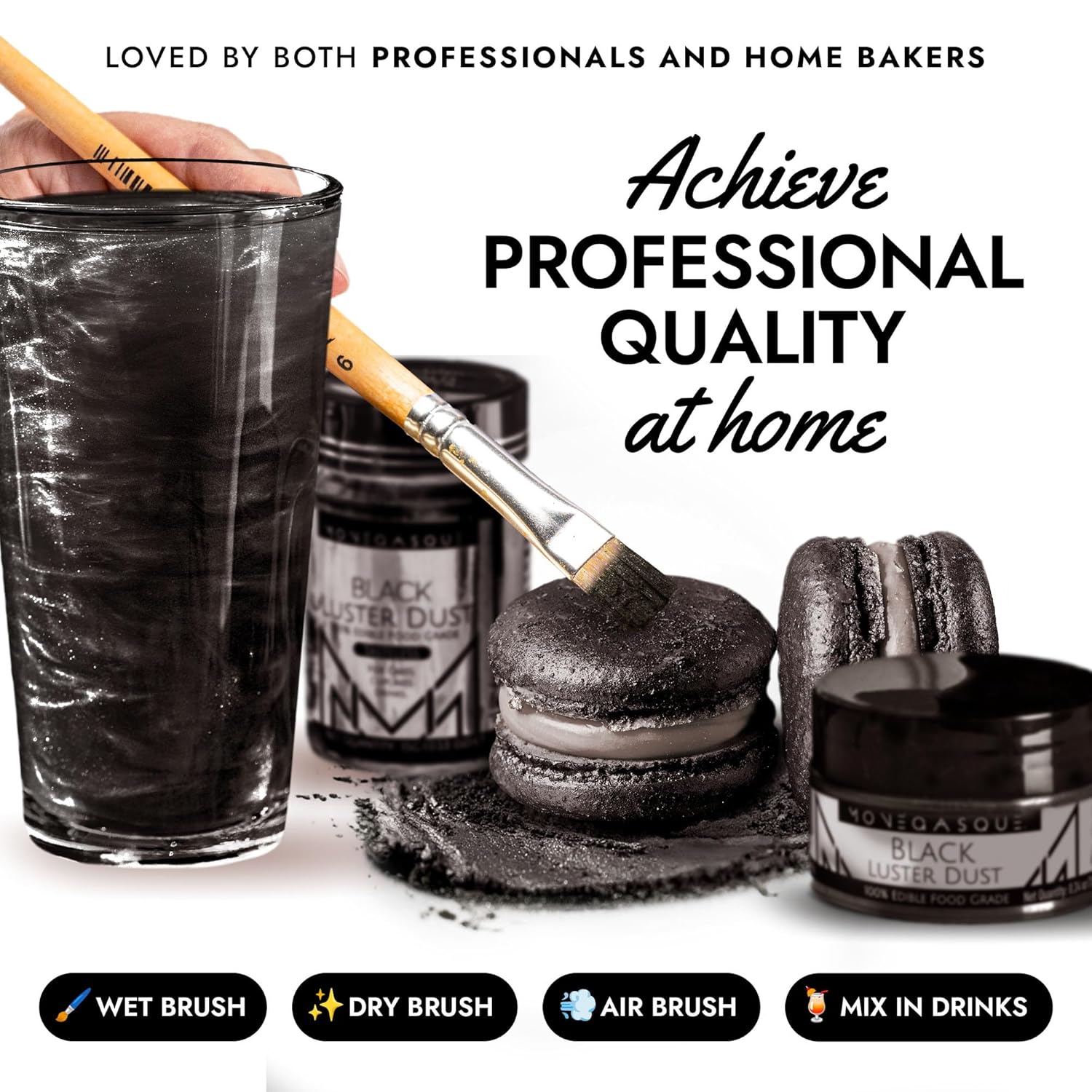 - EASY TO USE: Our black luster dust is incredibly versatile. Apply with a wet brush, airbrush, or dry brush, and even mix into beverages. Achieve professional-looking results effortlessly at home, whether decorating halloween cakes or adding shimmer to cocktails.