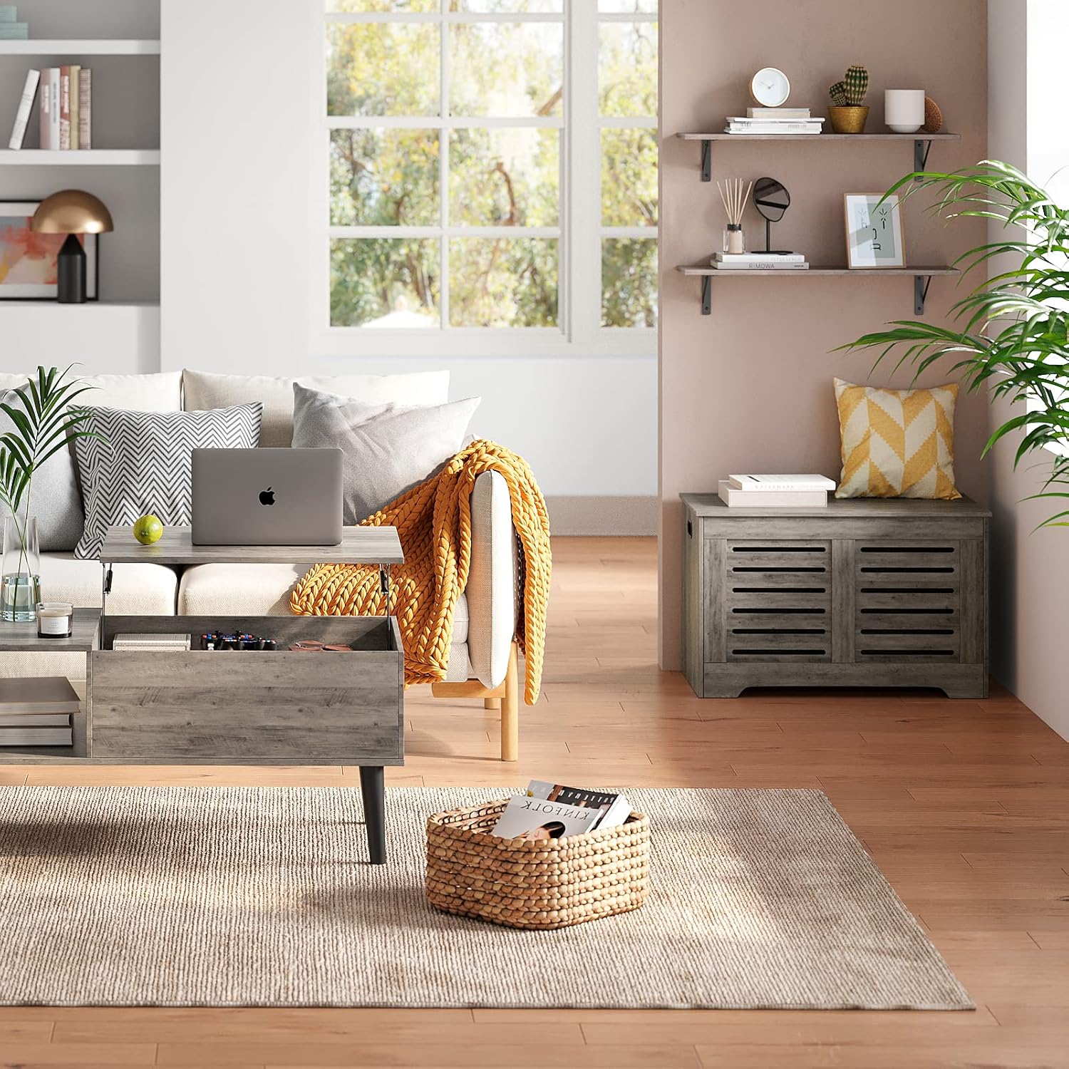 - ăBeautify Your HomeăElegant grey wash color complements tough lines, rusticity wood grain and industrial design add a classic and stylish vibe to your home. A perfect combination of wood and iron, bringing you a cozy life easily by placing some decorations. Matches with any wall perfectly
