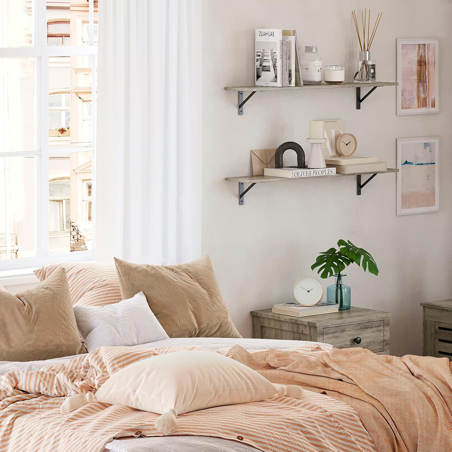 - ăFunctional Storage ShelvesăThe large wall shelves are gospel of small family to enjoy the tranquility of home. The wide shelves for wall allow you to store books, games, decorations, plants, towels etc. Create extra storage in living room, bathroom, bedroom, closet, balcony, study, kitchen, laundry, bar area, pantry and office, etc