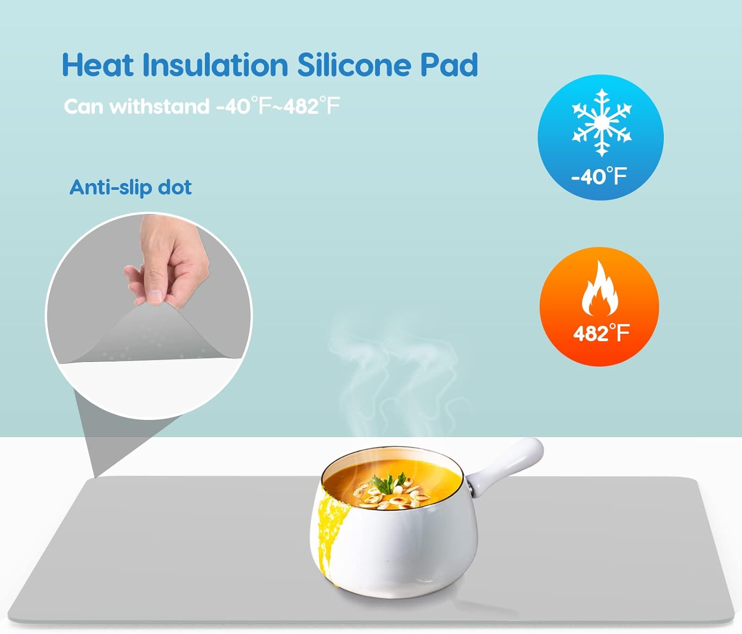 - 【WATERPROOF & ANTI-SLIP】: The smooth side face up be suggested, as it is not sticky and very easy to clean. Heat resistant silicone mats can be wiped directly with a rag and be washed with soapy water. Spilled resin/glue/paint solidification can be peeled off straightly. We suggest the side with particles face down, as the particles could hold the flat surface tight and helps contain the mess your kid makes from eating or playing.