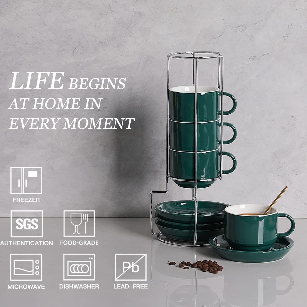 Sweejar Porcelain Cappuccino Cups with Saucers and Metal Stand, 8 Ounce Stackable Espresso Cups for Specialty Coffee Drinks, Latte, Americano, Tea - Set of 4 (Jade)