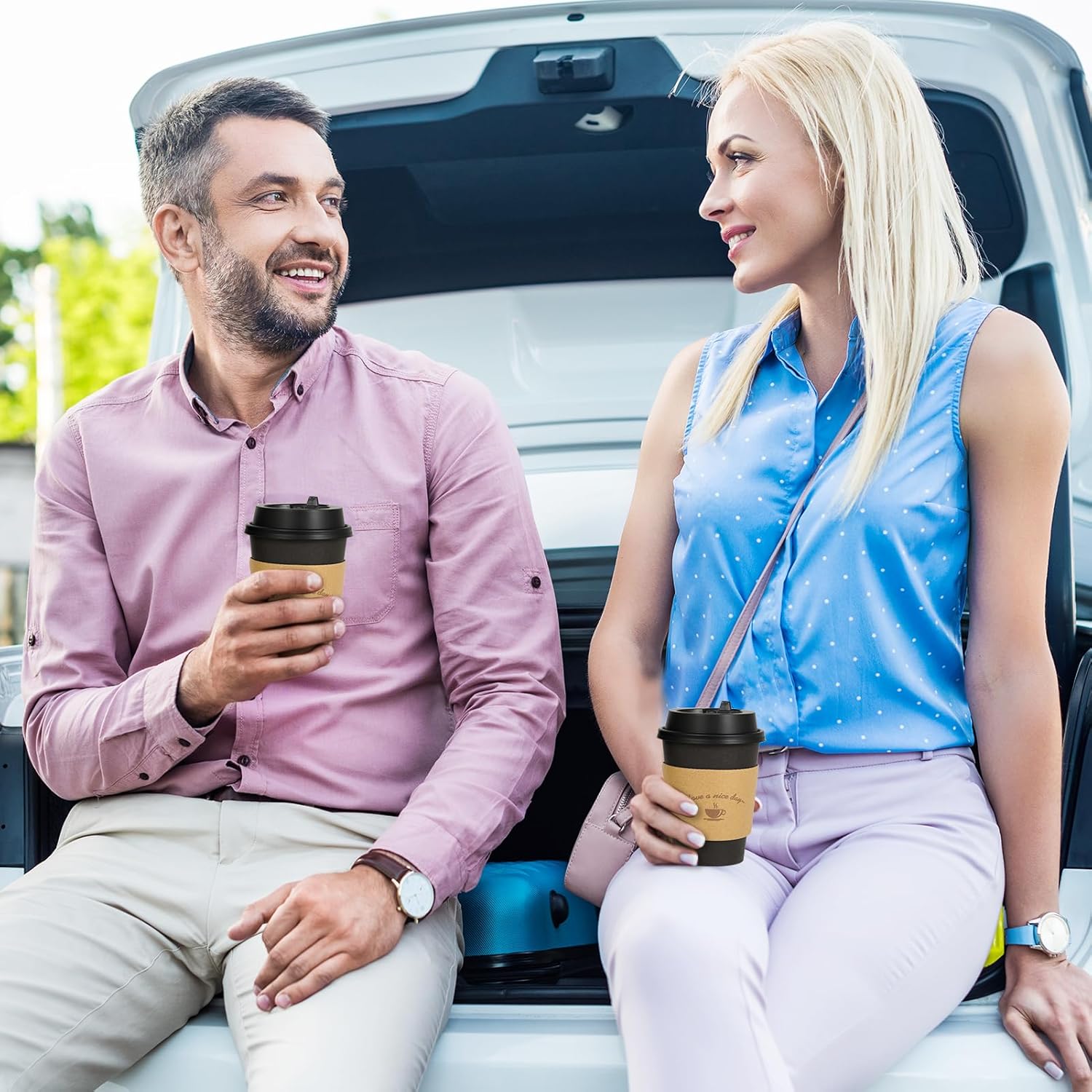 - Great Value Bulk: You will receive 100 coffee cups with black bodies, 100 packs of black matching lids, 100 kraft paper filled cup sleeves, and 100 straws; This set of 12 oz disposable coffee cups has the quantity to meet your family and party needs