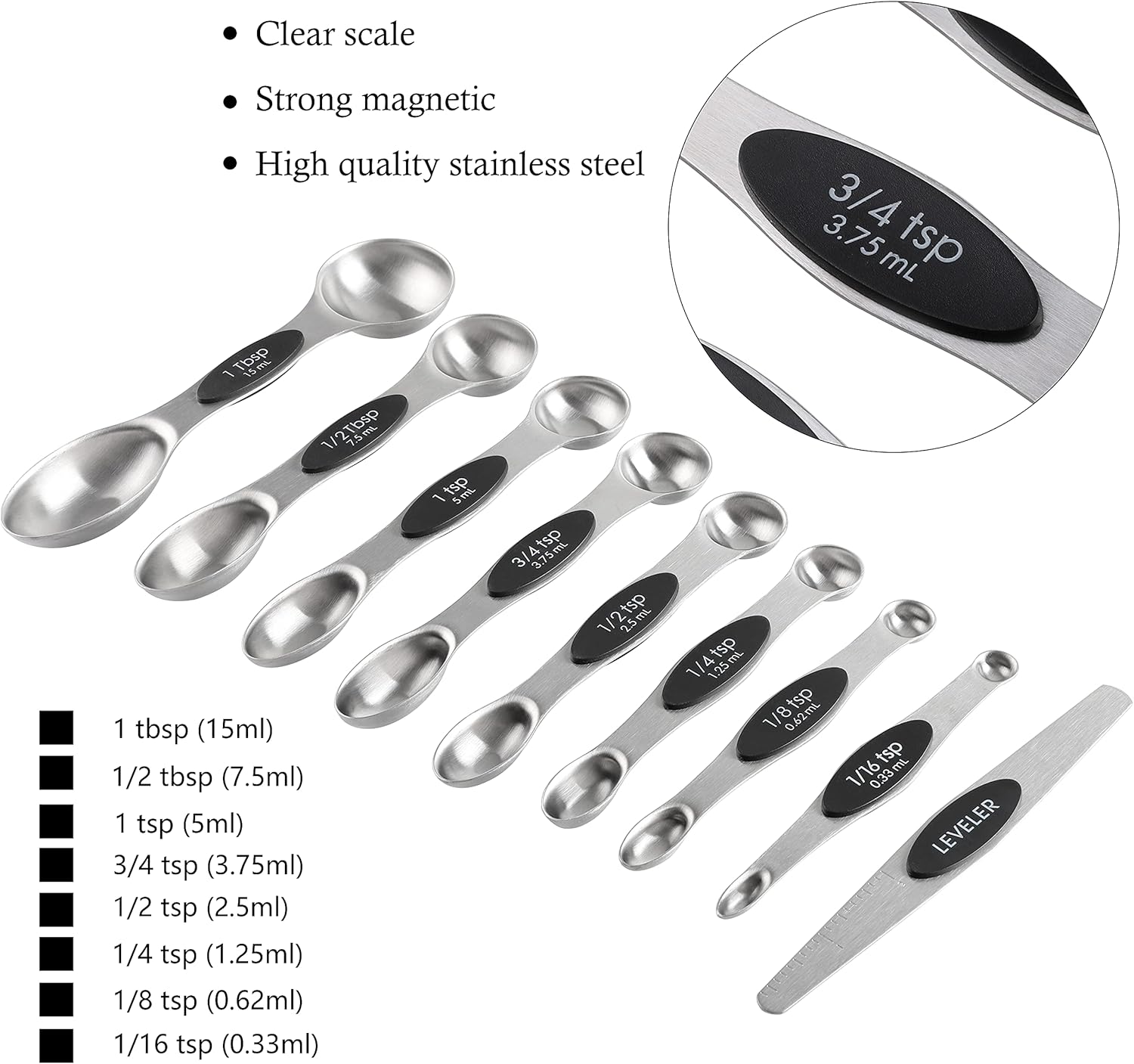 - [Magnetic Spoon]This set of measuring spoons is made of high quality stainless steel,and middle of spoon is double-sided magnetic.So can be stacked and easy to store.The magnetic force between them will not be messed up on the table after you use it up.Dry or liquid ingredients can be used on both sides of the measuring spoons.The leveler help you smooth out the amount you need.