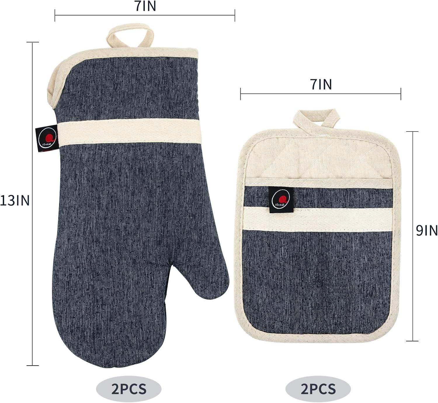 - OVEN MITTS AND POTHOLDER SET: The oven mitts (7*13 inch) and potholders (7*9 inch) can protect your wrists and forearms very well. Combination of neoprene and cotton for maximum flexibility and heat protection; soft and super comfortable.
