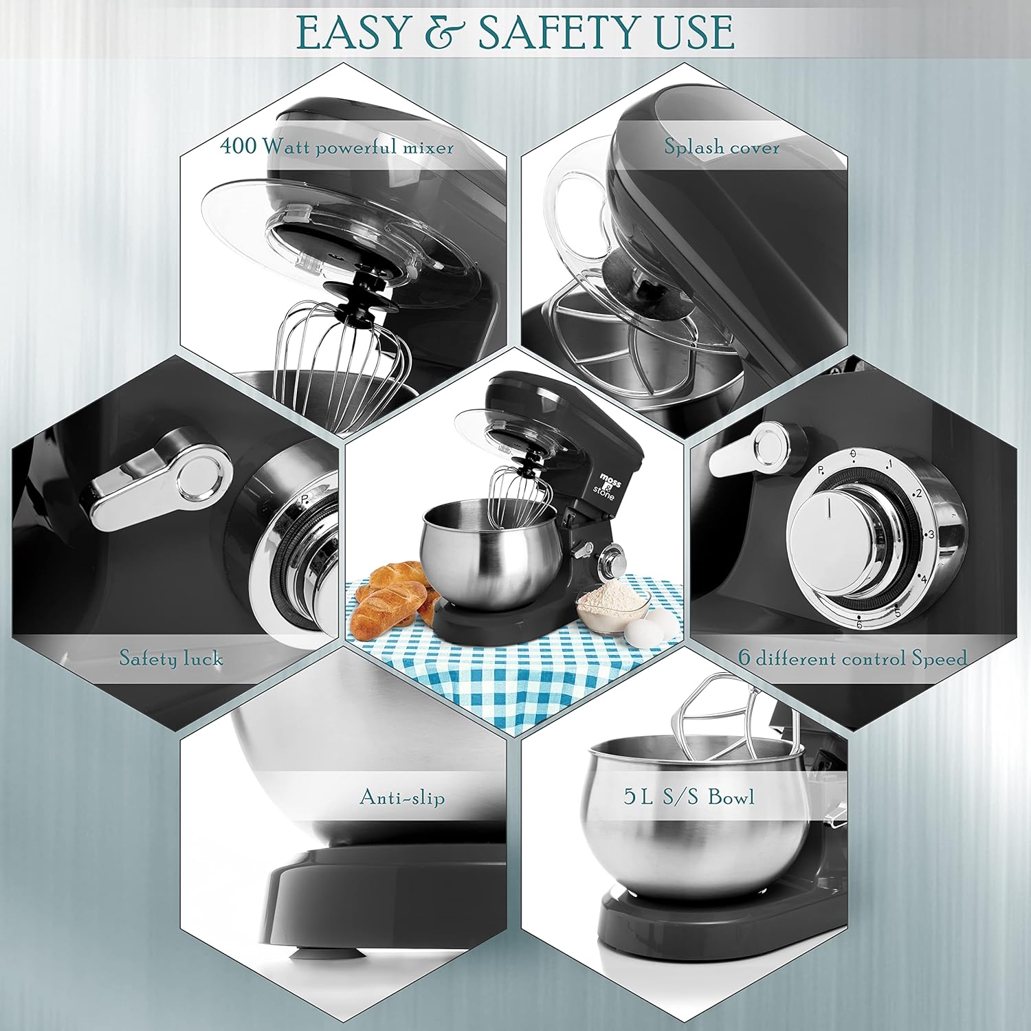 - Powerful Motor & Variable Speed Control: With a 6-speed controller with pulse function and 400w powerful dough mixer machine, you will easily handle your work to let you choose from a slow stir to a fast mix, suitable for different ingredients, stirring, folding, kneading, mixing and beating.