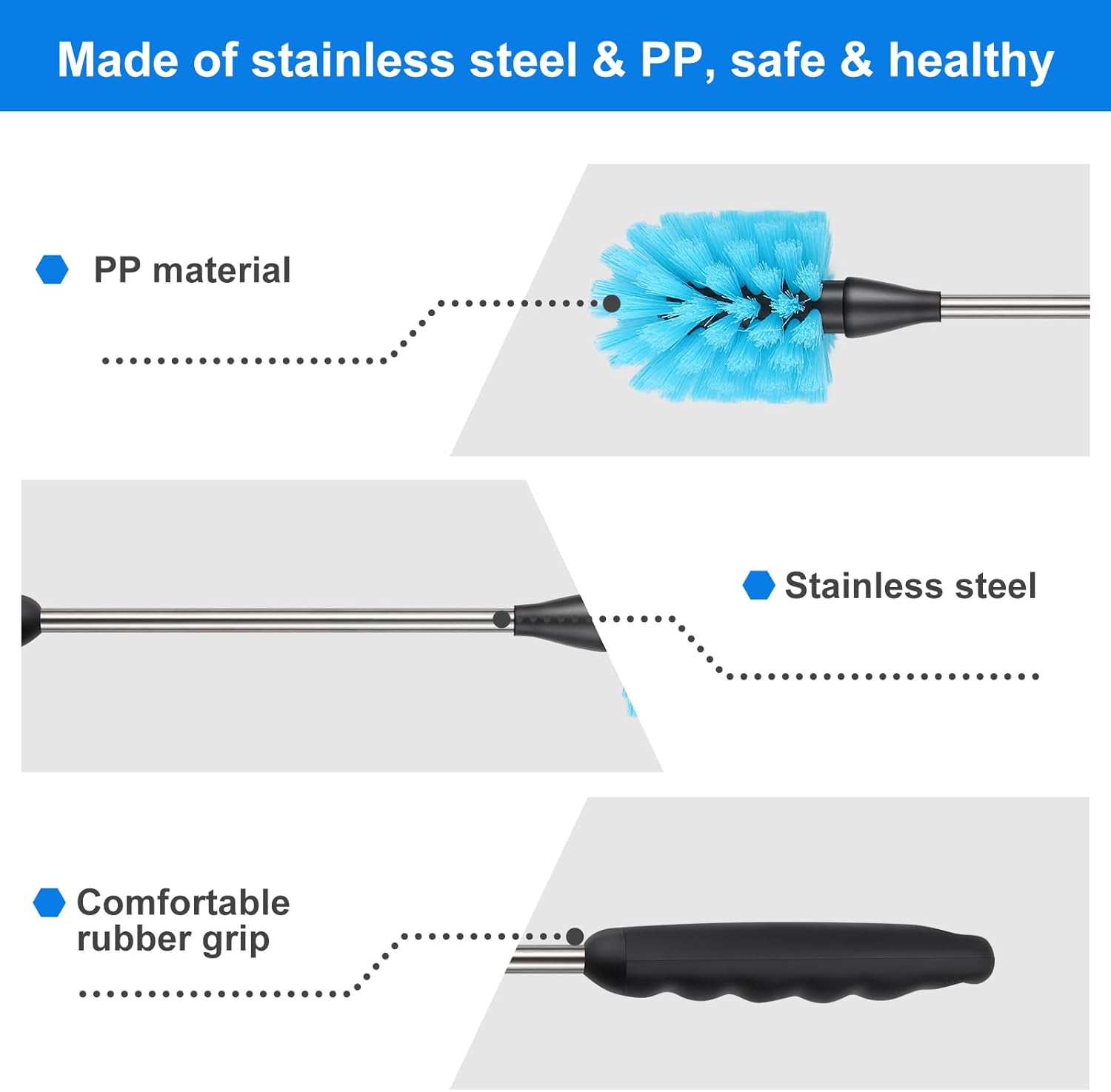 - The water bottle cleaning brush is made of premium stainless steel and high-quality nylon material, which is comfortable and flexible, odorless and safe, and won't leave scratches on your water bottle.