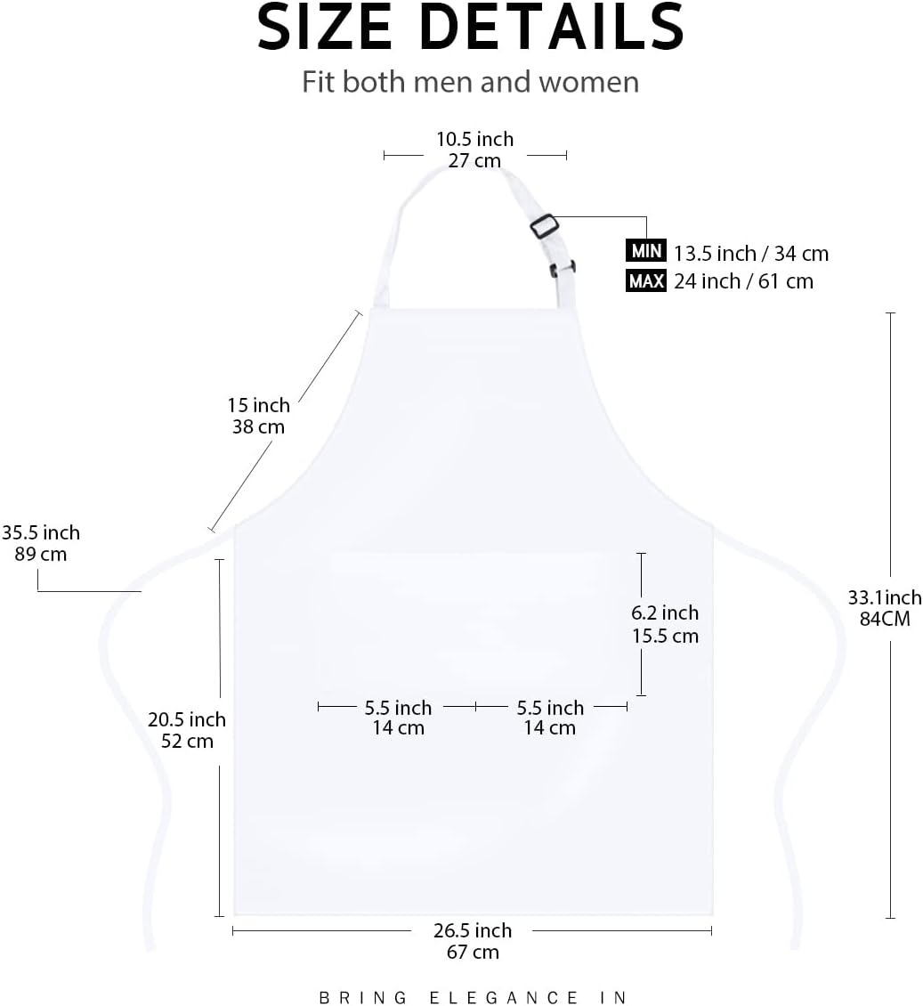 - Large bib Apron that covers from chest to knee provides great coverage and protection from kitchen grease, spills and food stains. Note: do not place apron nearby any heated cooking ware or flame.