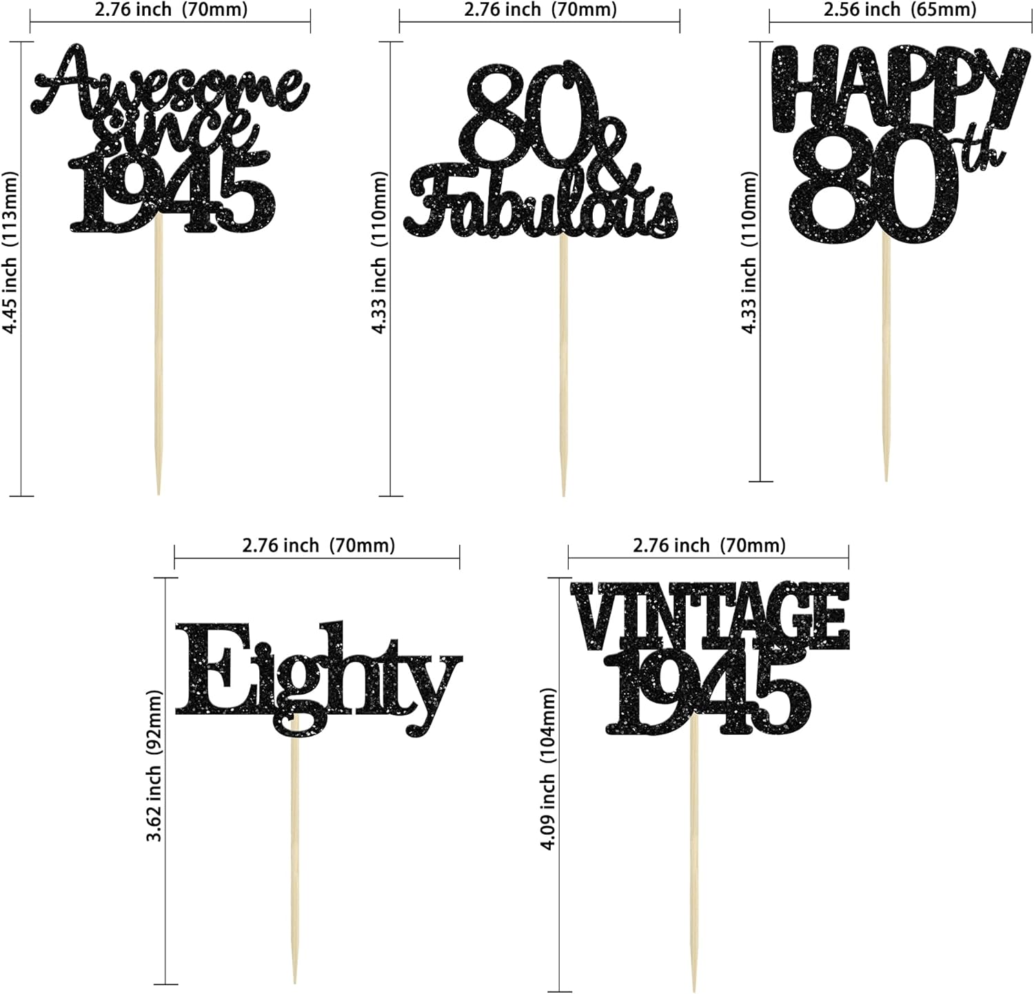 Gyufise 30 Pack Vintage 1945 Cupcake Toppers Glitter Cheers to 80 Fabulous Eighty Cupcake Picks 80th Birthday Wedding Anniversary Party Cake Decorations Supplies Black