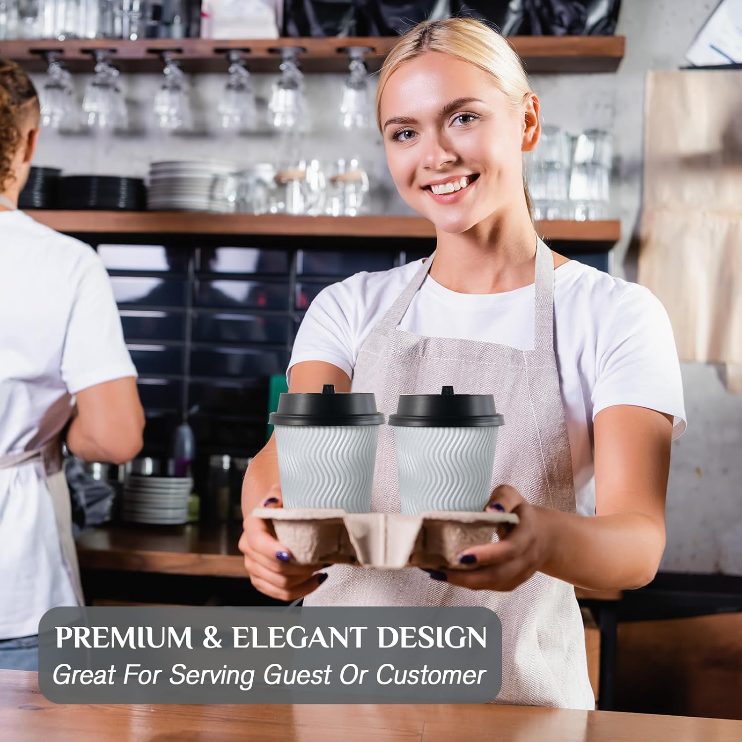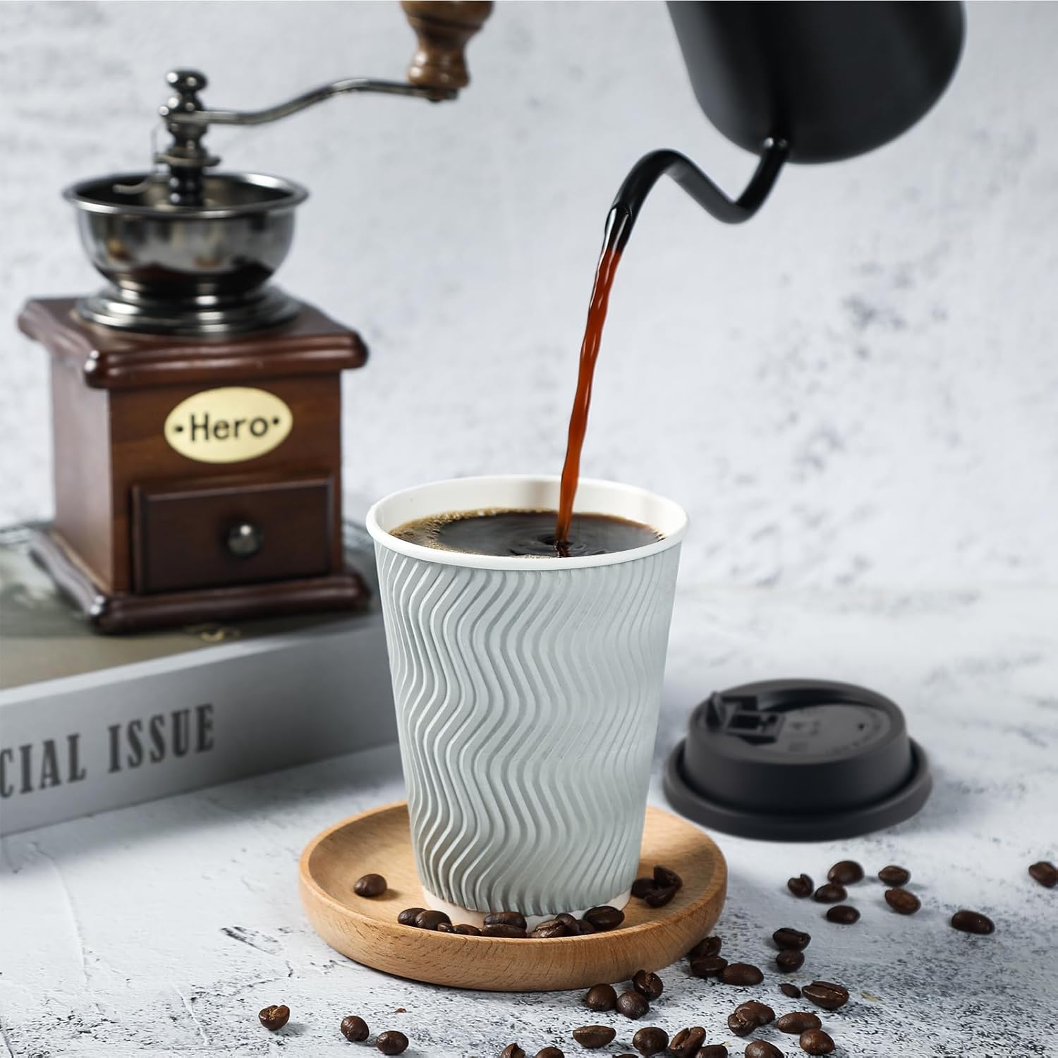- Materials: Each disposable paper coffee cup 12 oz is made of thickened paper. Silver grey kraft paper of outer layer is pressed out in smooth ripple patterns for non slip grip and comfortable touch. Elegance and quality coexist for one cup