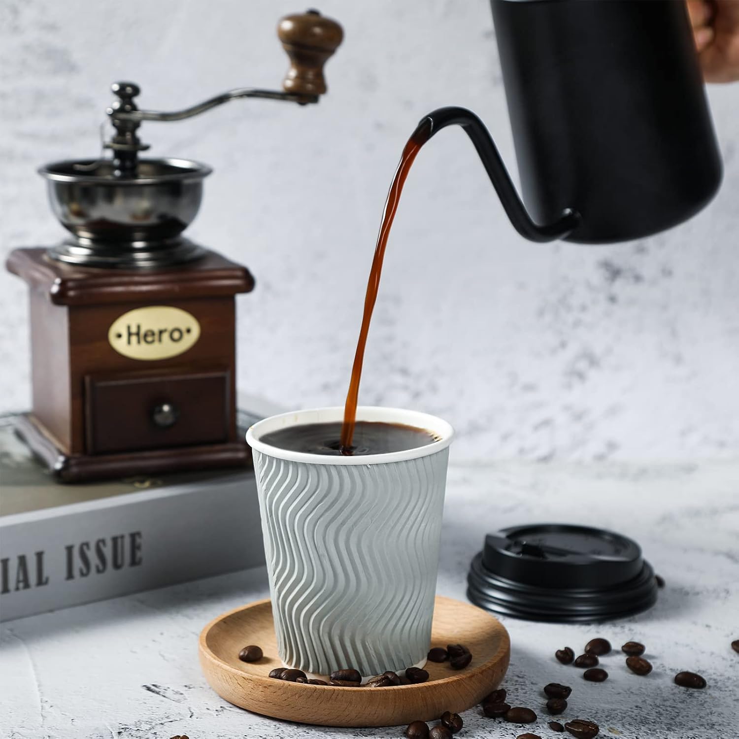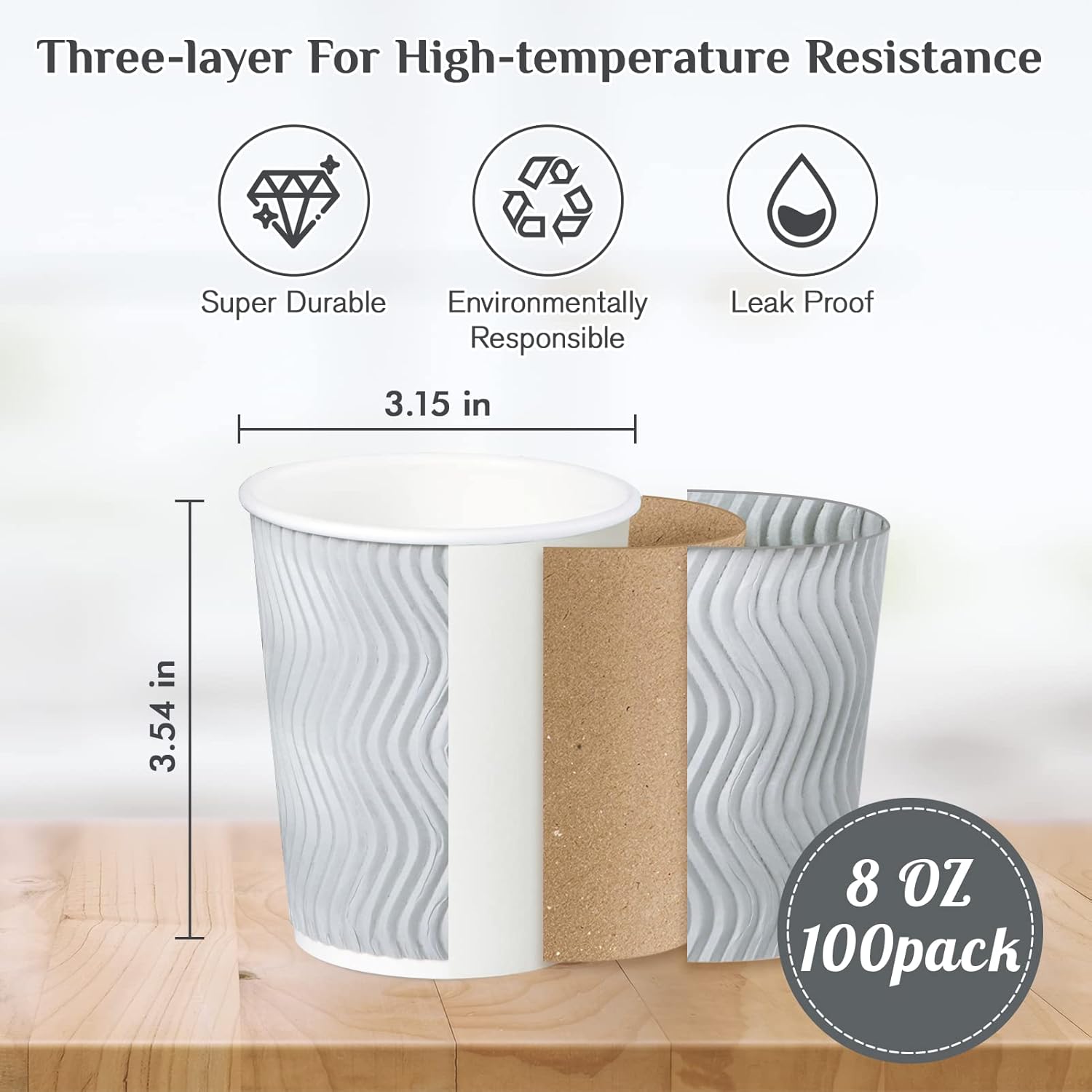 - Materials : Each disposable paper coffee cup 8 oz is made of thickened paper paper. Silver grey kraft paper of outer layer is pressed out in smooth ripple patterns for non slip grip and comfortable touch. Elegance and quality coexist for one cup