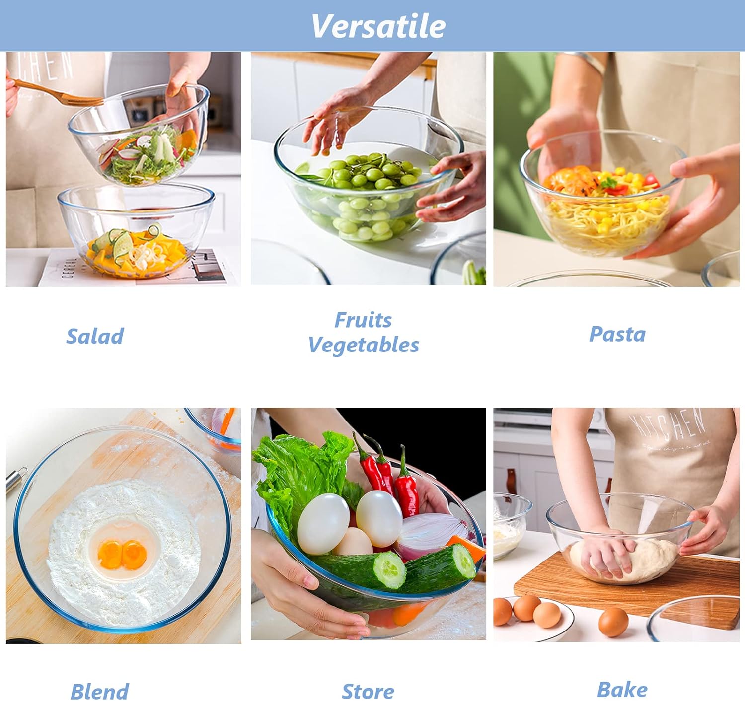- 【Elegant Design & Easy to Clean】Clear glass allows easy monitoring of contents.The wide-mouth design makes mixing and pouring effortless, Its deep bowl structure prevents spills and suits baking,meal prep, storage,and more kitchen tasks. while the smooth surface ensures quick cleanup—either by hand or in the dishwasher.The sleek,transparent design adds a touch of elegance to any kitchen,blends seamlessly with any décor—perfect for both prepping and serving,from everyday meals to dinner parties.