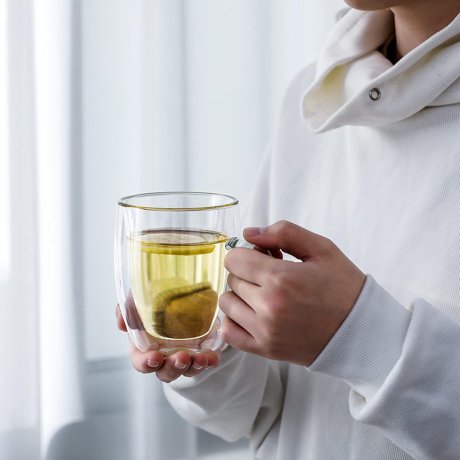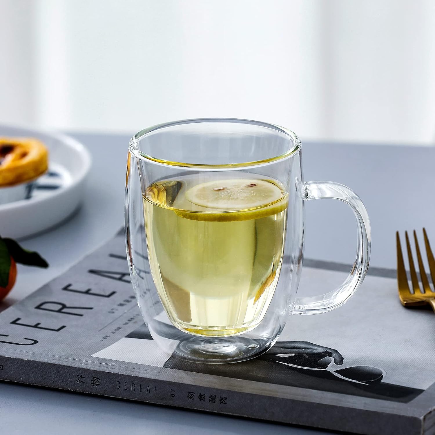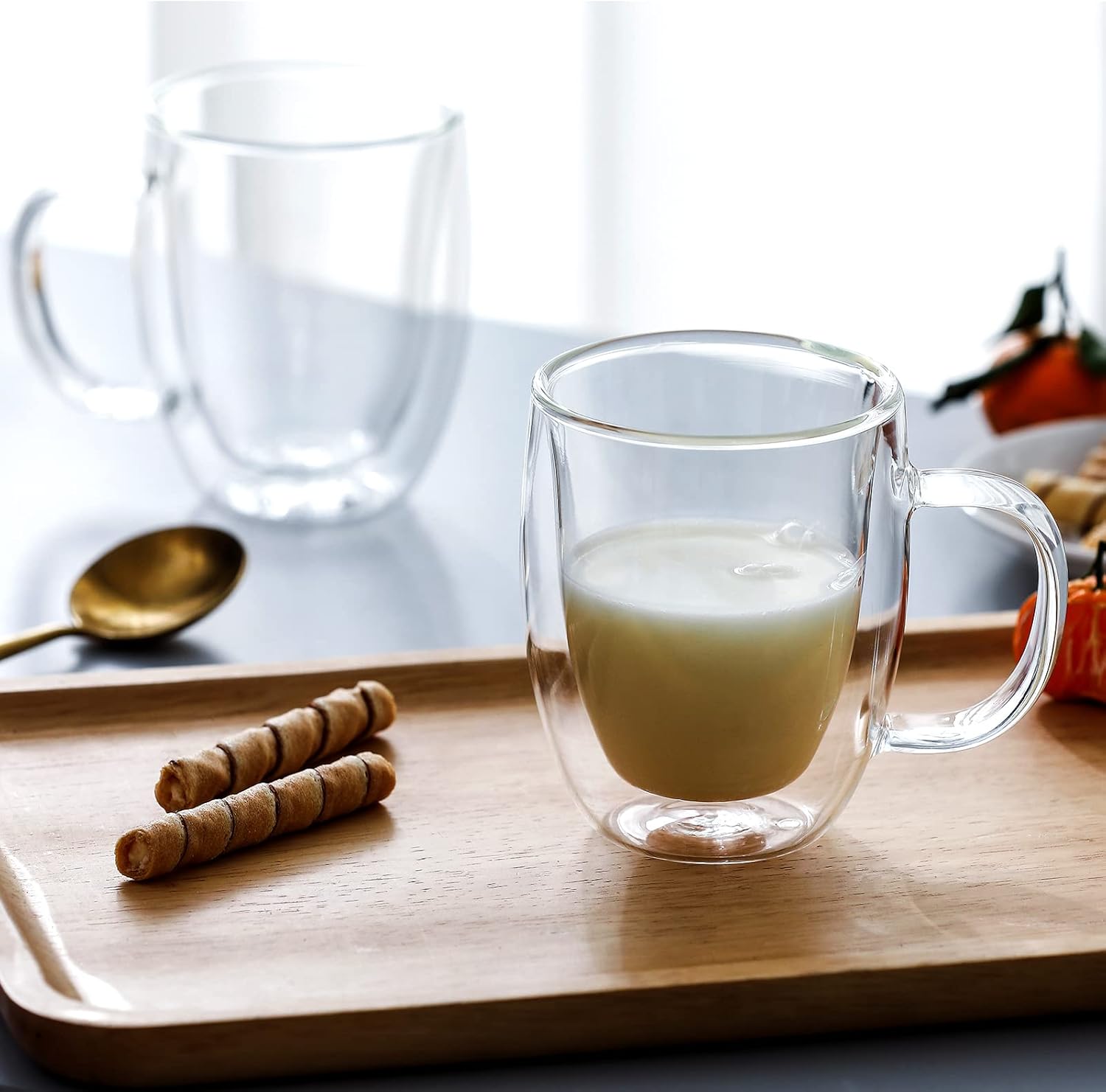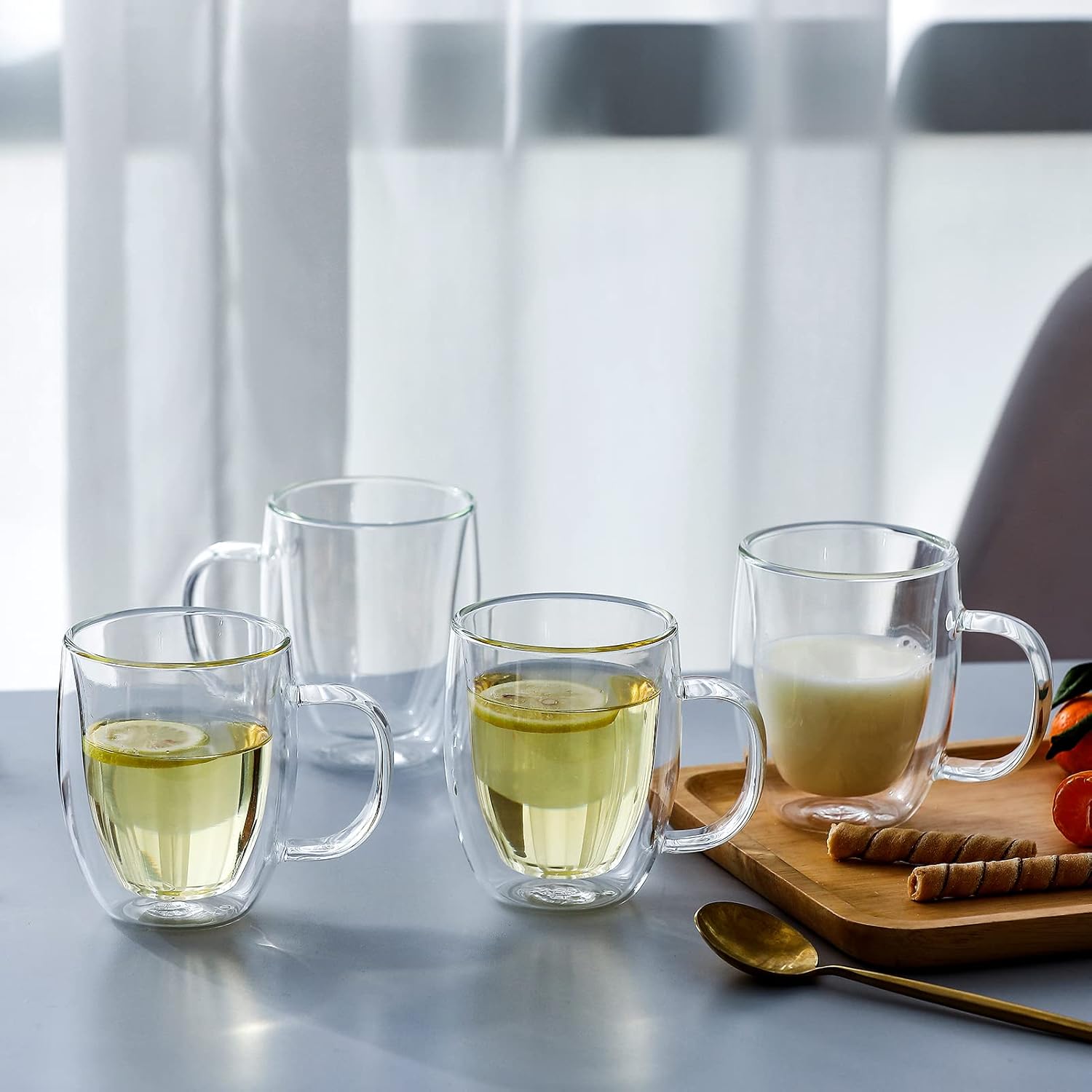 - ☕Take your coffee breaks to the next stage with these Glass Coffee Cup! These double walled glasses are mouth blown hand-made with high quality borosilicate glass by skilled artisans. Each package comes with 4 clear large mugs that are elegant and functional as well. You can use them for various beverages such as coffee, milk, juice, tea, and more. These will also make great gifts.