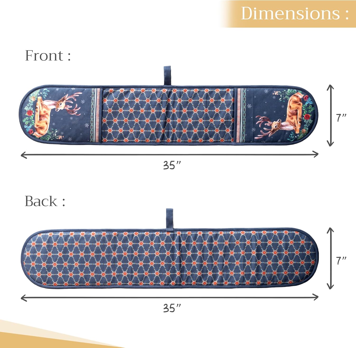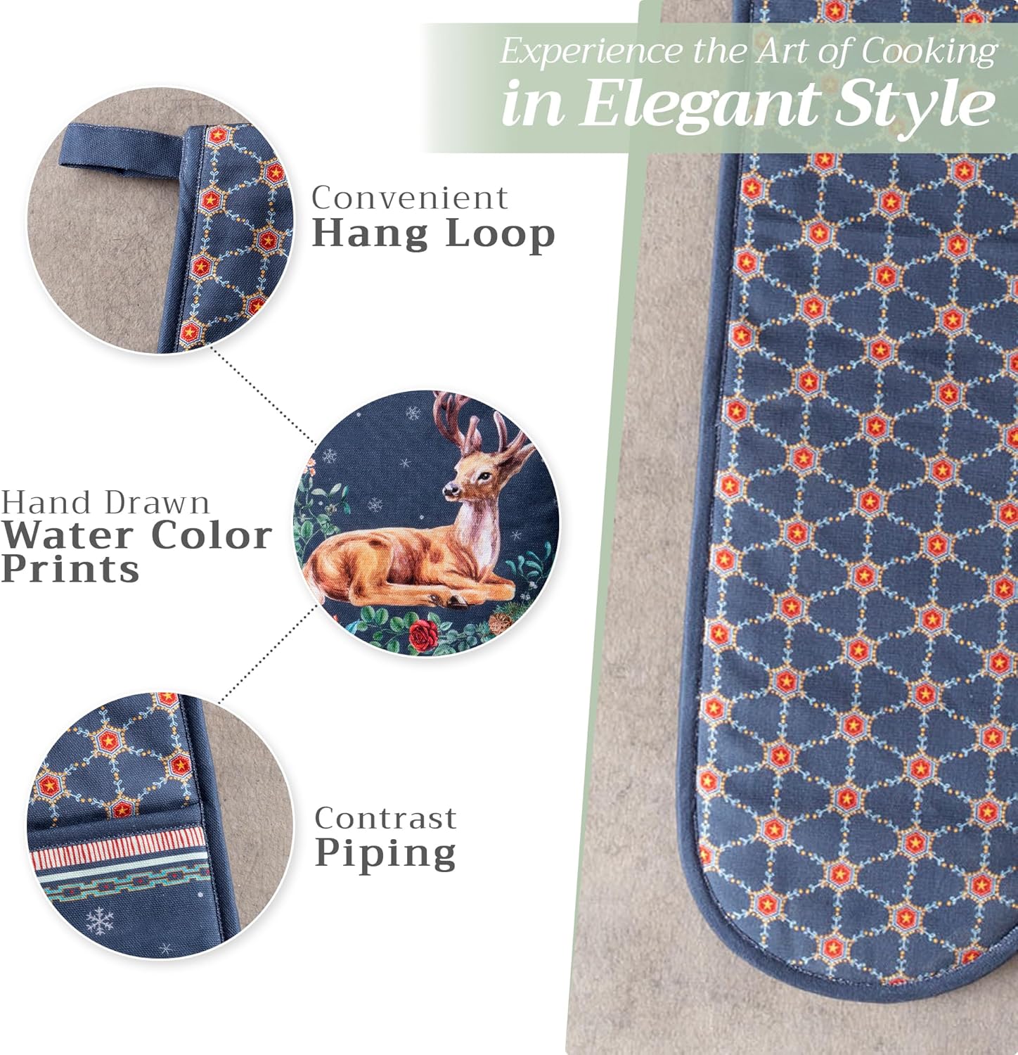 - Package includes: Includes 1 double oven mitt sized 7"x35". Perfect for handling hot cookware safely while adding a touch of European elegance to your kitchen. Designed in Europe and made in India with care