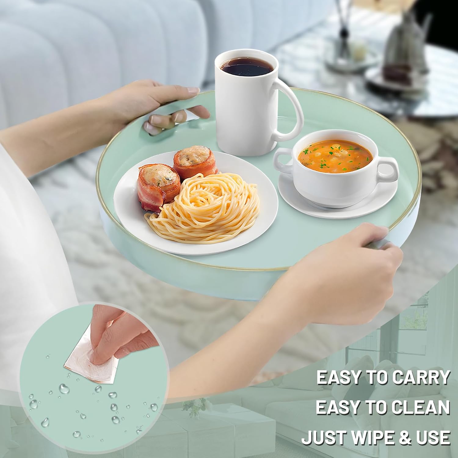- TRAY DECOR: Mint green tray is often used to present food and drinks in an appealing and organized manner. Round table tray can enhance the visual appeal of the items being served, making them more enticing to guests or customers. Also place it on your bathroom vanity as an exquisite showcase for perfumes, jewelry, or bath accessories.