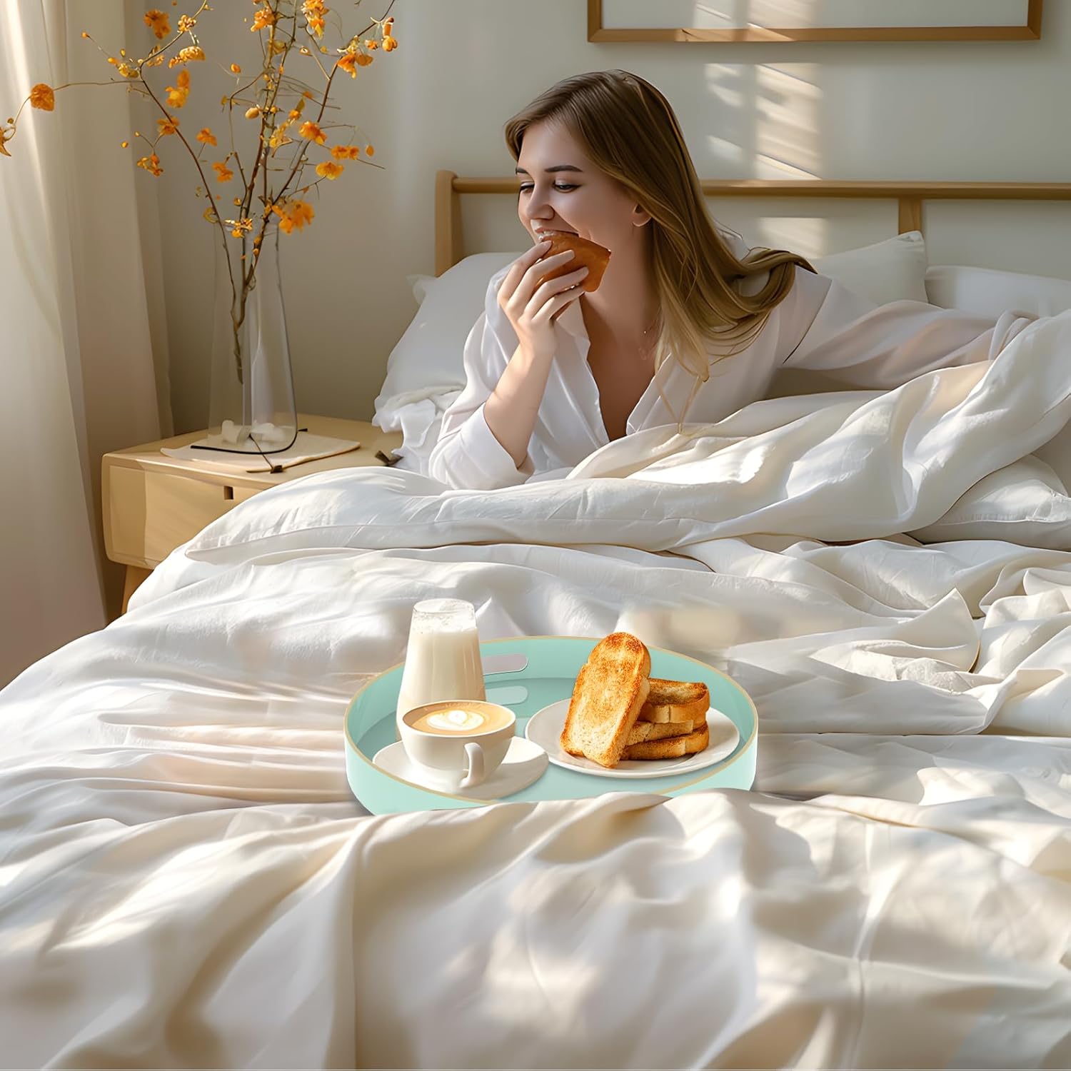 - PLASTIC SERVING TRAY: Round serving tray provide a stable surface for plates, cups, and utensils, making it easier to carry and enjoy your meal without spills. Not only can it be used as a breakfast tray for enjoying breakfast in bed, but it also be used as a perfume tray, bathroom vanity tray, jewelry tray, accessory tray and makeup tray.