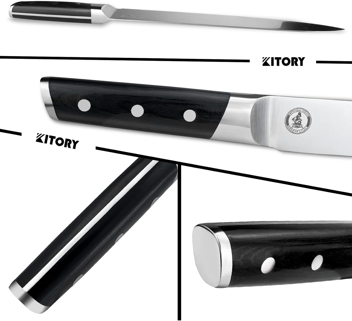 - Unprecedented Comfortable Contral - The handle of this KITORY slicing knife is made of high quality Pakkawood, ensures superior strength and durability. Compared with most other slicing knife on the market, the handle of this carving knife is thicker and longer, with 5.31 inch length and 1.18 inch thick. What’s more, the shape of whole handle follows the inverted trapezoidal design, which means the thickness decreases from the head to the tail, making it more comfortable and labar saving grip.