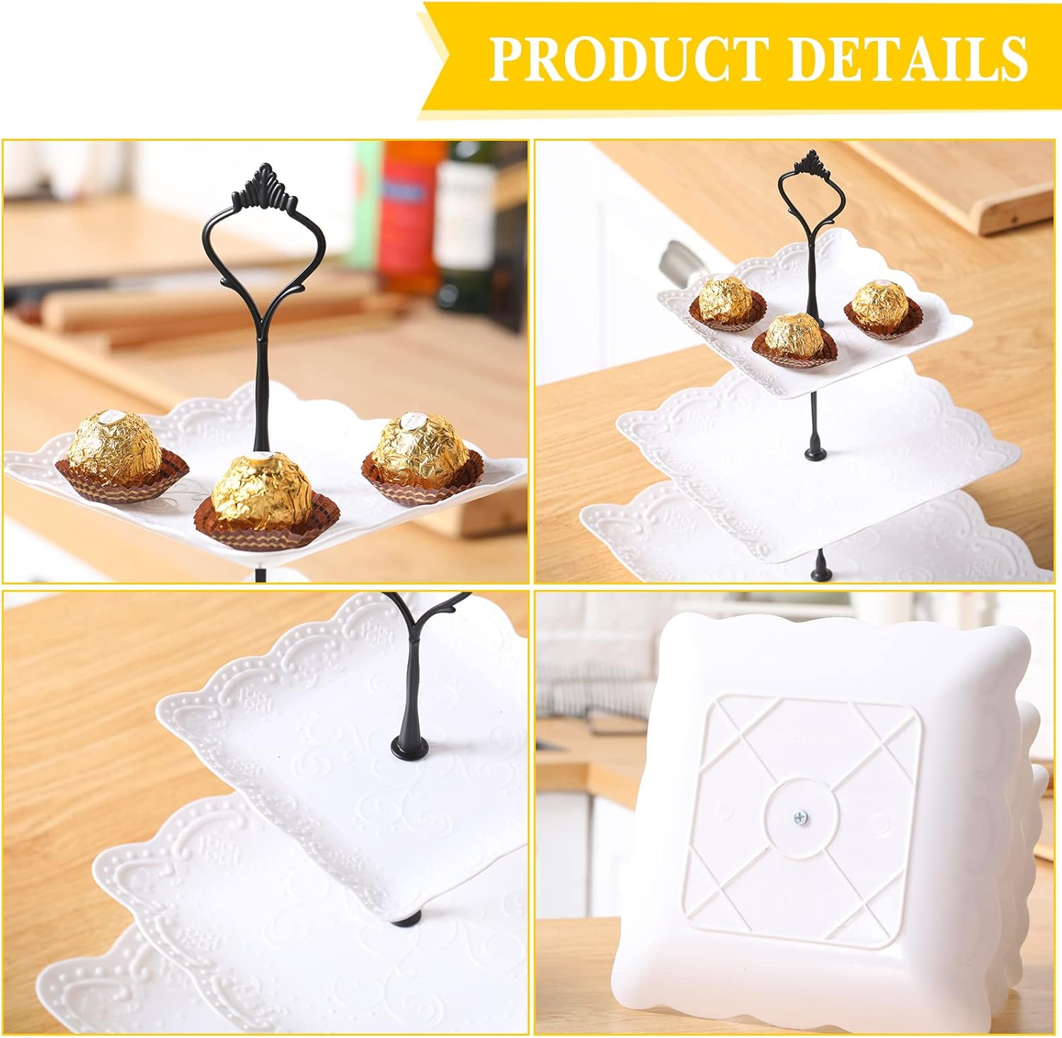 - Stylish and Beautiful: there are 3 different distinctive shapes of our 3 tiered round serving stand, including the square, round and flower, the exquisite shapes can pair well with cupcakes, appetizers, fruit, brownies, desserts, they will make your food more attractive