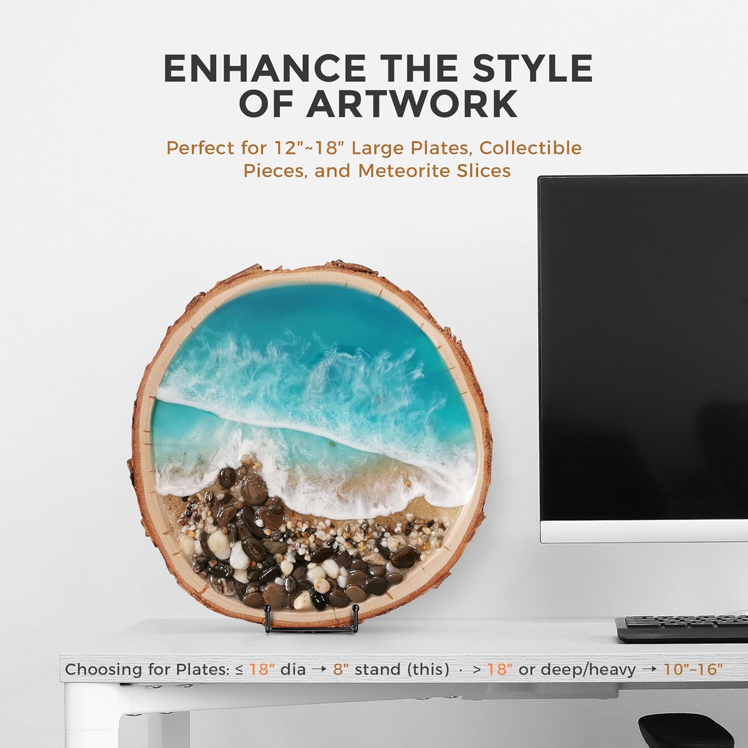 - CHOOSE YOUR LARGE STAND: - 8 inch plate stand fits items of 9″ ~ 24″ Height / Diameter, Lip depth: 2" with a perfect 10° tilt angle design, and 3.75" widened design to hold heavy and thicker artworks, frames and plates up to 10 pounds.