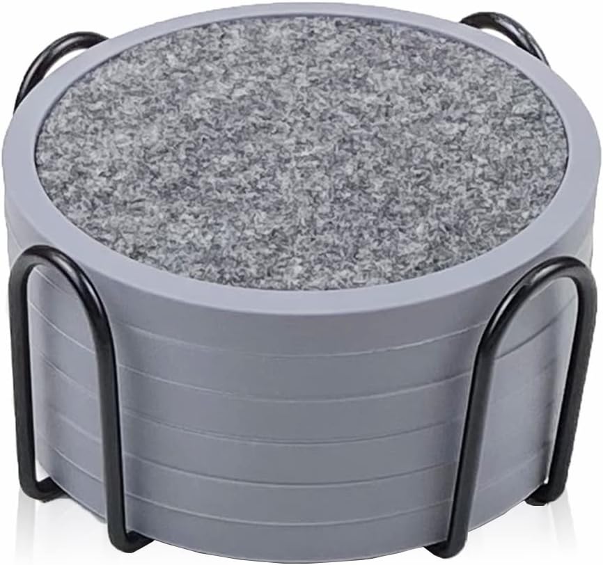 - WHAT YOU GET: 6 non-slip silicone drink coasters(round, black, 4.3 inch), 6 absorbent felt inserts(round, black and gray) and a 4.5-inch metal holder(black). The silicone coasters can be used alone, or with the inserts.
