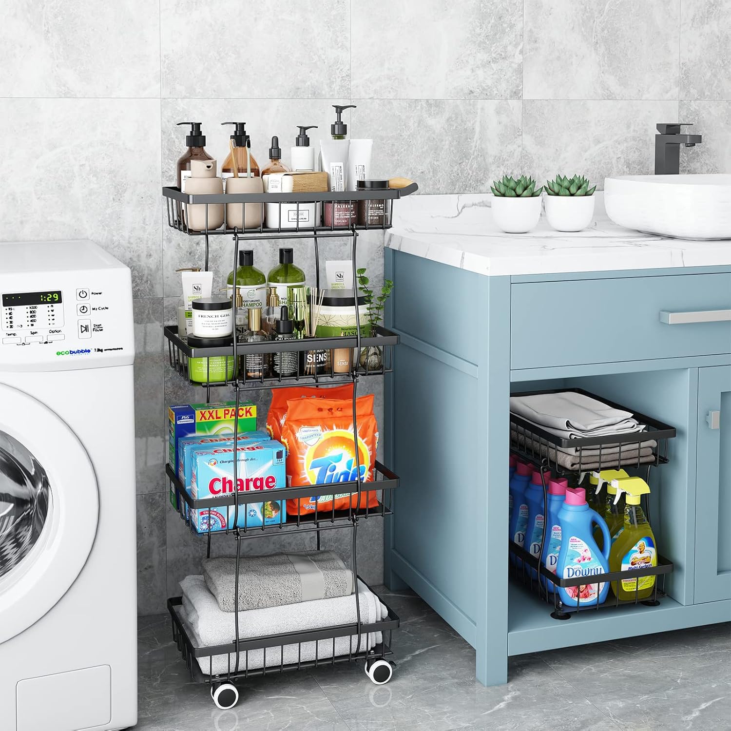 Fruit Vegetable Storage Basket for Kitchen - 4 Tier Slim Stackable Metal Wire Basket Cart with Rolling Wheels Utility Rack Onions Potatoes Organizer Bins for Kitchen Pantry Black