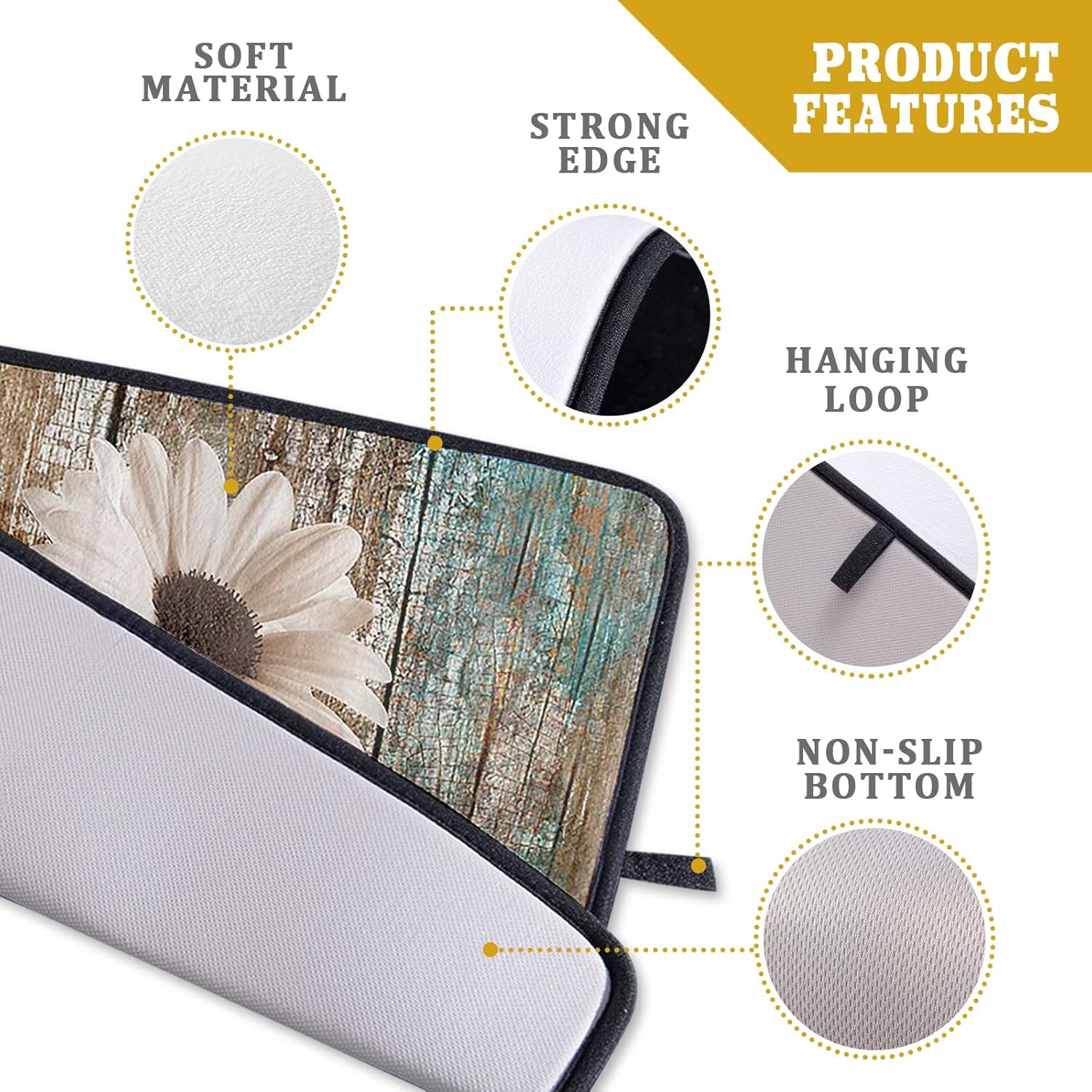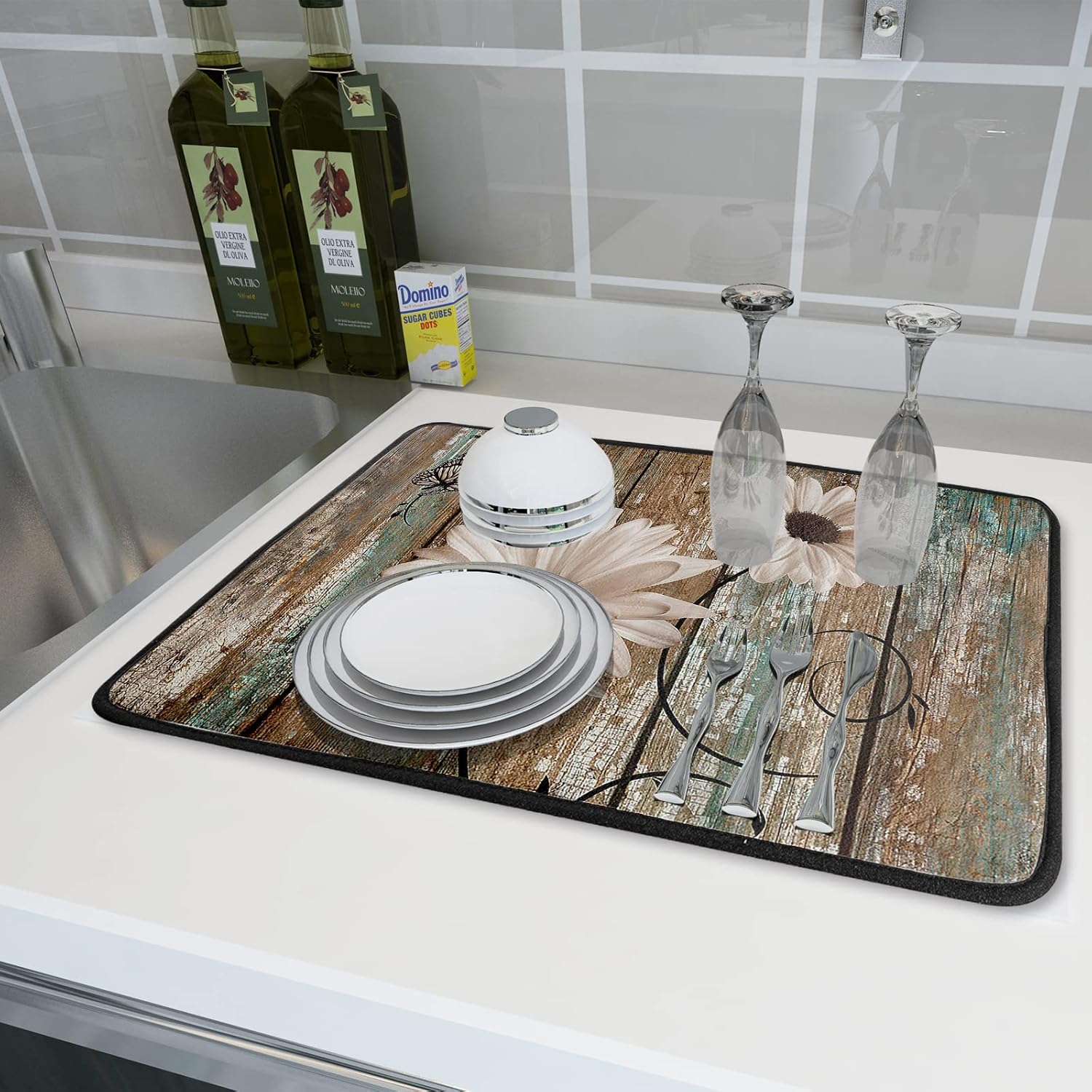 - ❀ 【SPECS & WATERPROOF BACKING】 Made of absorbent fabric, this 3-ply polyester of this Daisy Flower Dish Drying Mat provides a soft cushion. 24" X18", fitting most counters snugly while providing a smart and sharp look, a gorgeous decoration for kitchen. Moreover, the waterproof backing stops liquids from soaking through, damaging or staining the surface below and allows moisture to evaporate quickly at the same time.